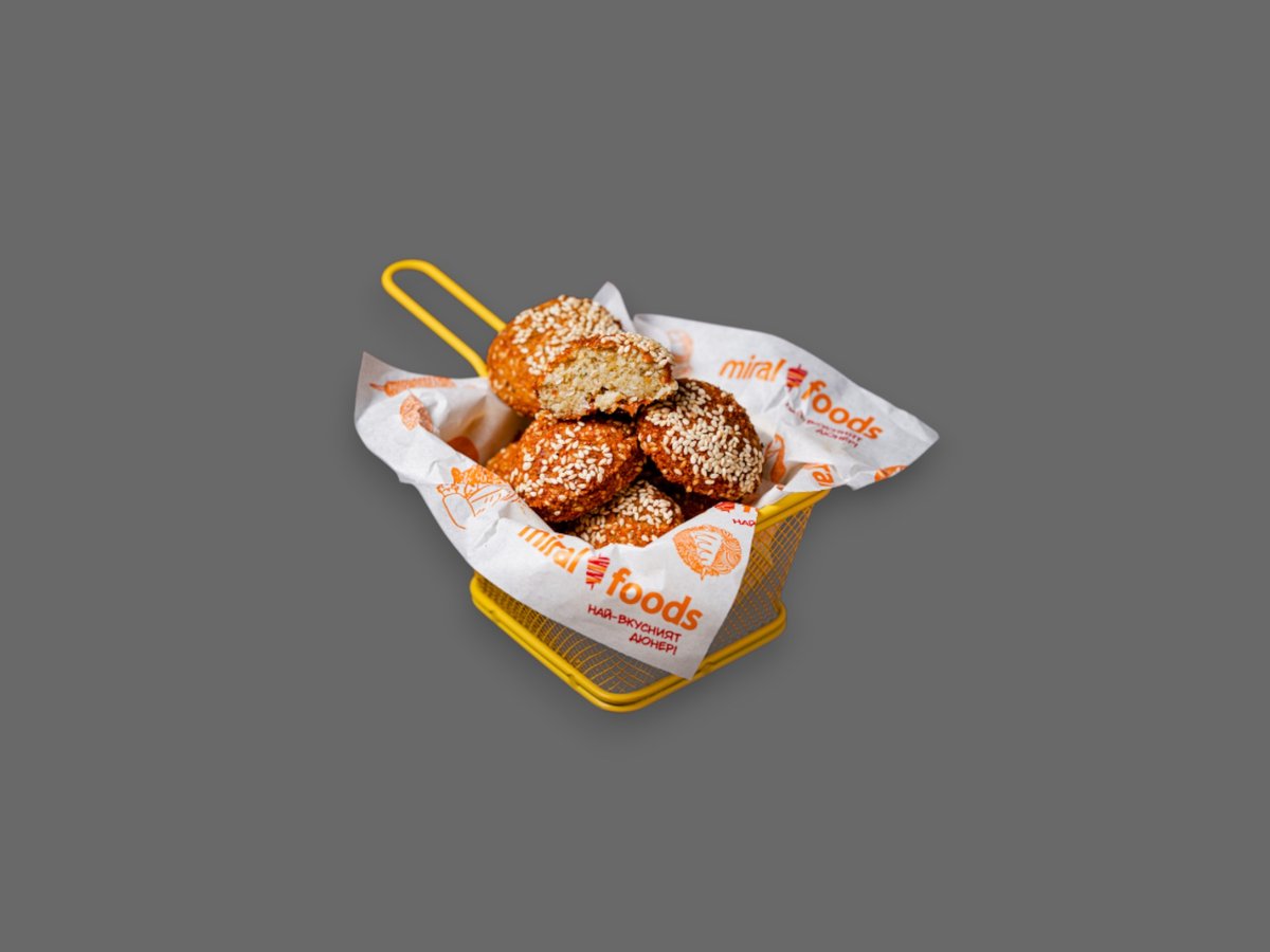 Арабска питка, 6 броя фалафел, домати ,маруля ,млечен сос, пържени картофи ;