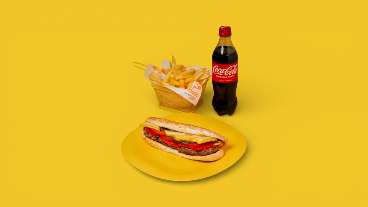 Дълга сусамена питка, телешка пикантна кайма, кисели краставици, домати, майонеза, кетчуп, пържени картофи + Coca-cola 500ml + порция пържени картофи ;