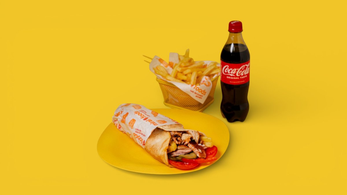 Арабска питка ,пилешко месо, кисели краставици, домати, чеснов сос, пържени картофи + Coca-cola 500ml + порция пържени картофи ;