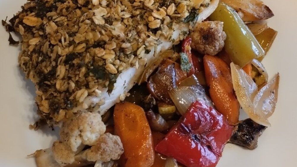 Бяла риба филе с гремолата и зеленчуци на плоча