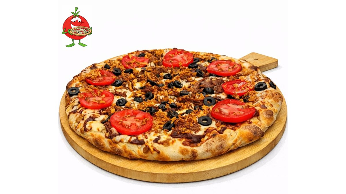 Барбекю сос, дърпано телешко, маслини, пресен домат, пържен лук, кашкавал.