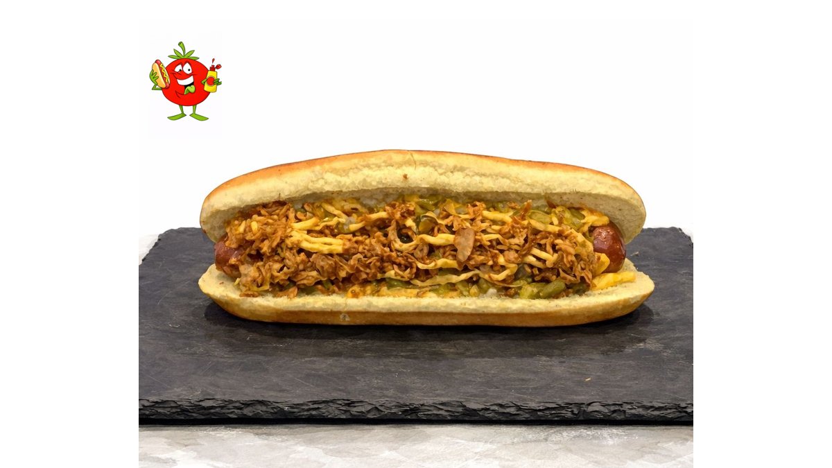 Доматен сос, кренвирш, кашкавал, кисела краставичка, разтопен чедър, хрупкав лук