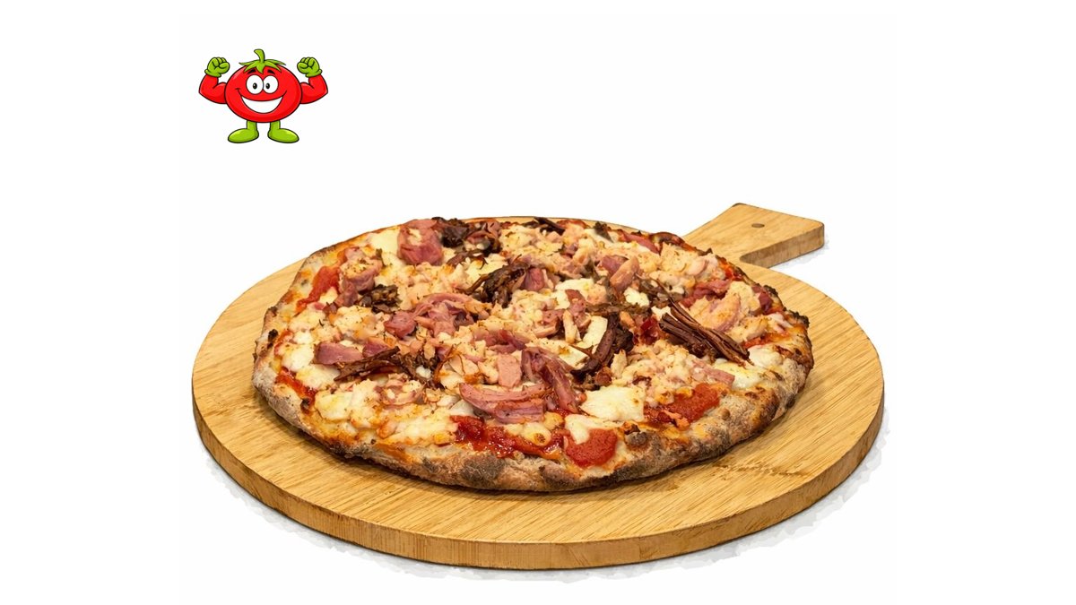 Протеинов пълнозърнест блат с 4 вида семена с дърпано пилешко филе, дърпано свинско, бавно печено телешко, доматен сос и моцарела Фиор ди Лате. Хрупкава, питателна и с 43 г протеин.