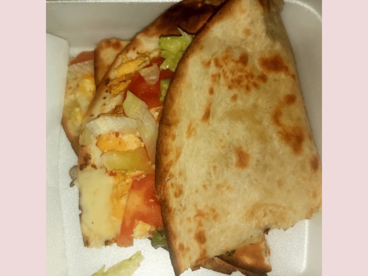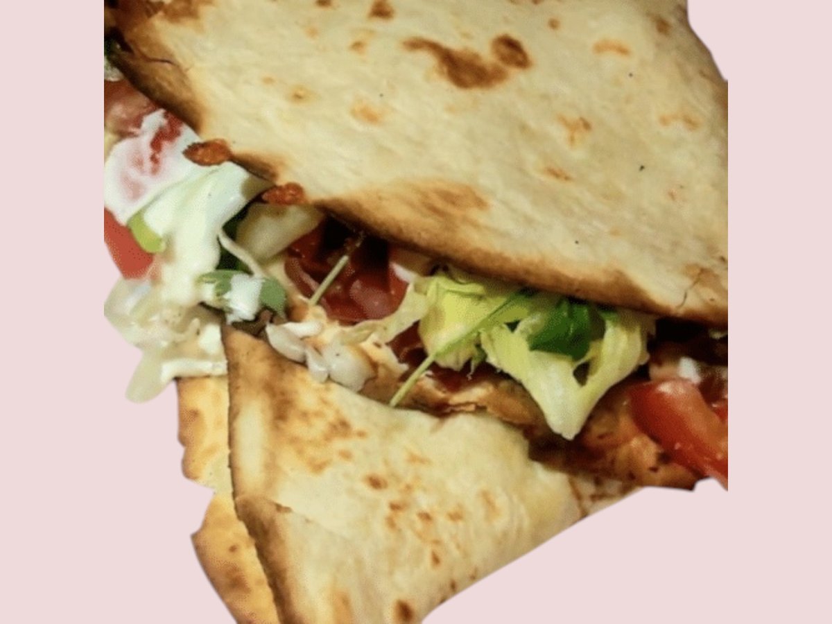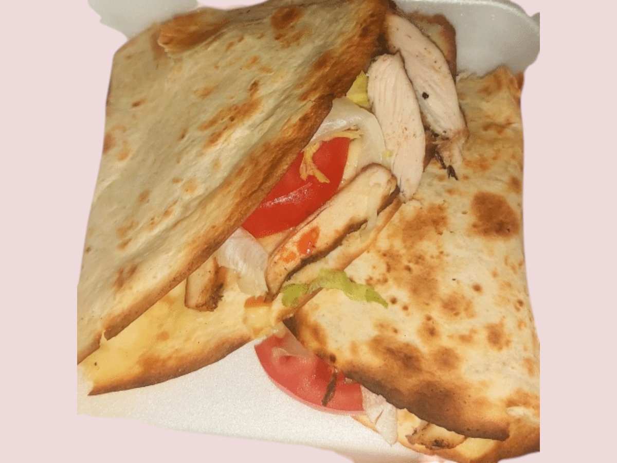 плоско италианско хлебче, пилешко филе, моцарела, ементал, топ. сирене, айсберг, краставица, черен пипер, зехтин 650г