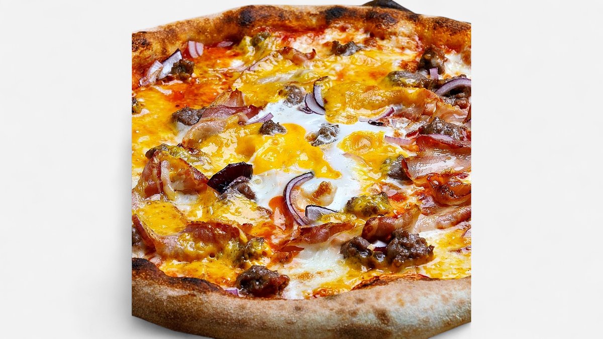 протеиново тесто, доматен сос mutti, лайт моцарела, дърпано телешко, чери домати, рукола, веган пармезан, пушена сол maldon, червен лук