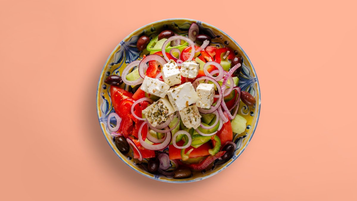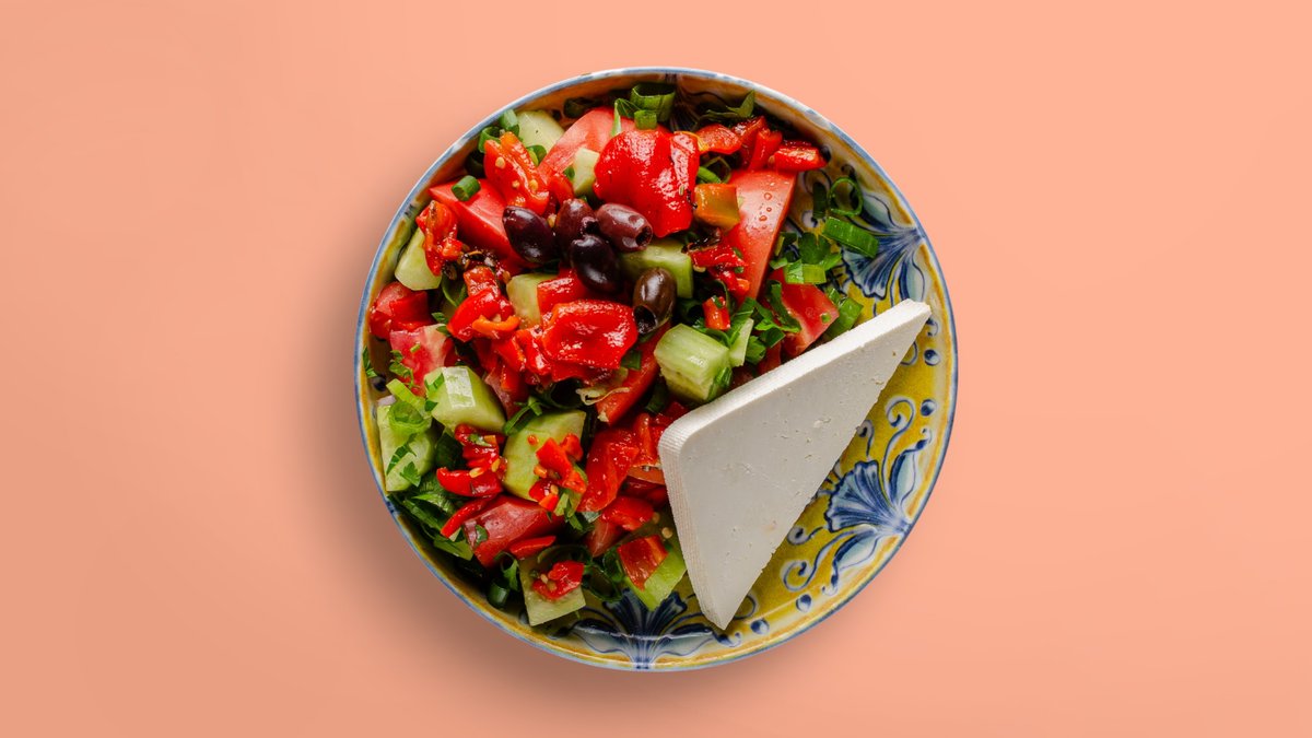 домати, краставици, чушка, червен лук, мариновано сирене, маслини, зехтин, риган 400гр