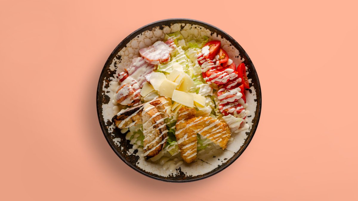 пиле бекон, салата айсберг чери домати, крутони, пармезан и дресинг 300гр