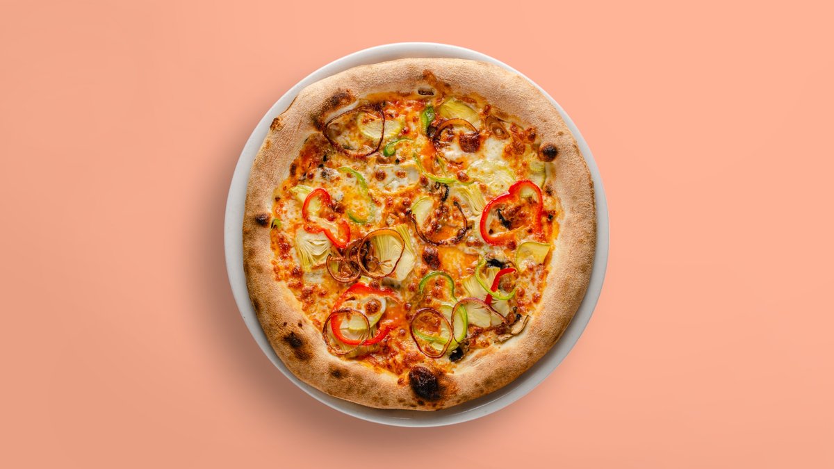доматен сос, моцарела, артишок, тиквички, гъби, чушки, лук 500гр
