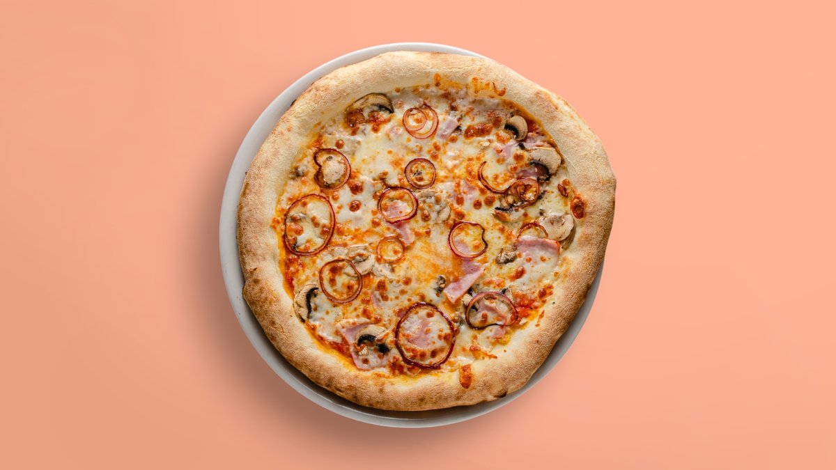 доматен сос, гъби, шунка, моцарела, лук 500гр