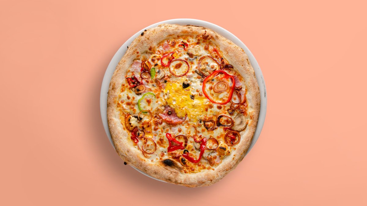 доматен сос, гъби, салам Наполи, шунка, яйце, бекон, лук, чушки, скаморца, моцарела 650гр