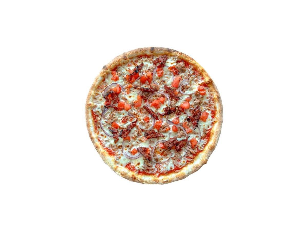 доматен сос, риба тон, моцарела, червен лук, сушени домати и пресни домати 230г