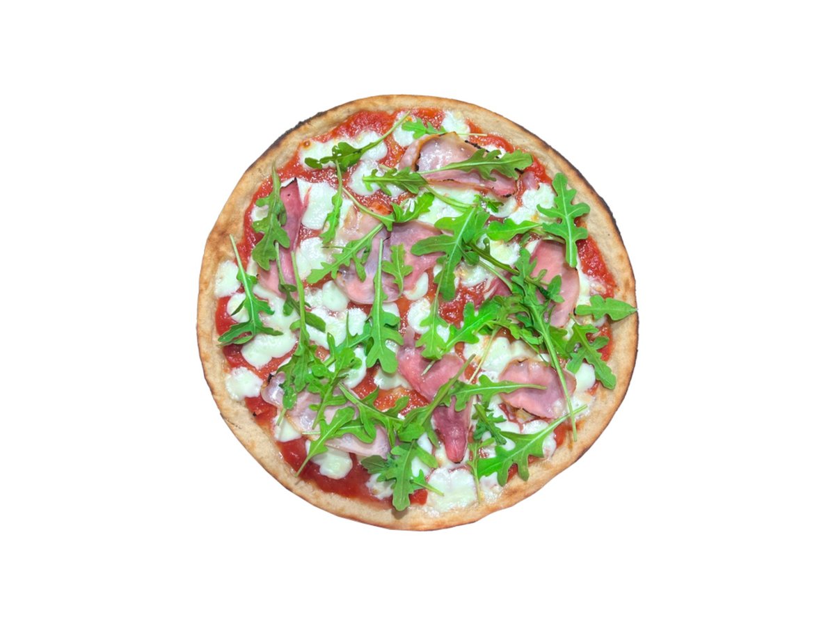 тесто от карфиол, доматен сос, прясна моцарела, прошуто Кото, рукола, 484 ккал, 25см, 350г