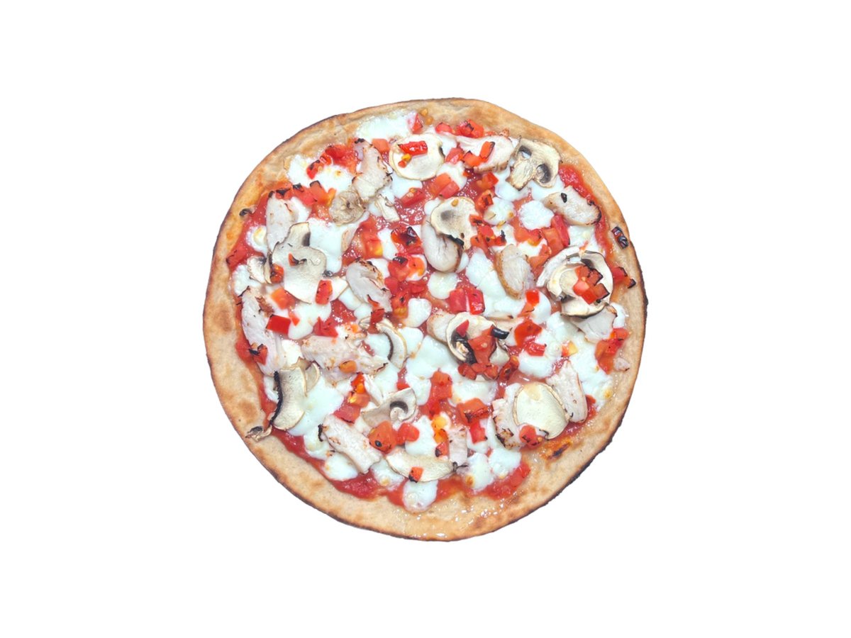 тесто от карфиол, доматен сос, прясна моцарела, пилешко месо, гъби, пресни домати, 450 ккал, 25см, 350г