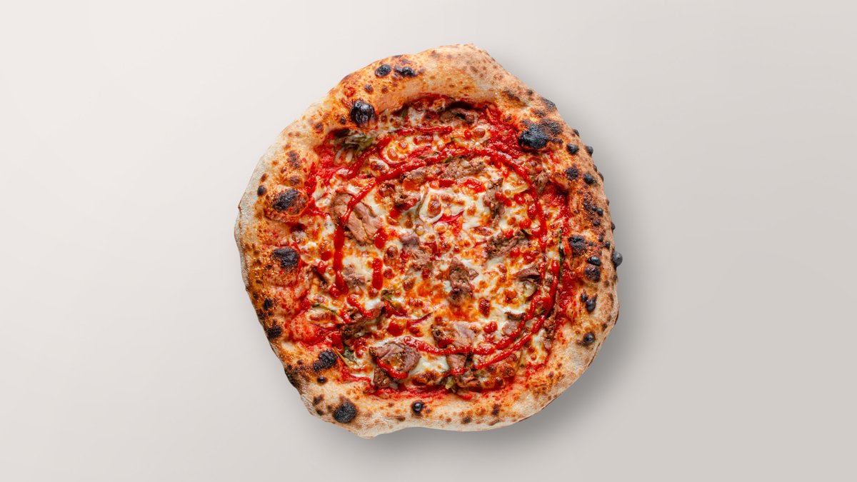 (32см, 600кал, 38г протеин) телешки стек на пица? О ДА! Маринован телешки стек по наша рецепта, кисели краставички, риган и чушки за свежест! Всички пици са приготвени със високо протеиново пълнозърнесто тесто, с двойна ферментация на над 50 часа