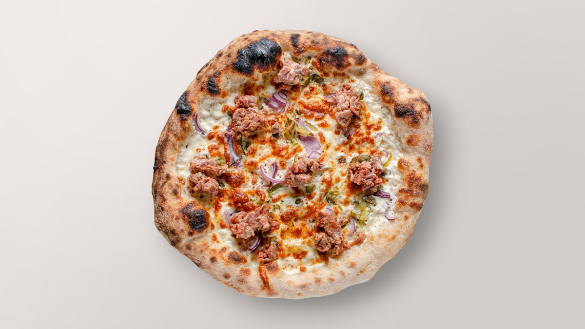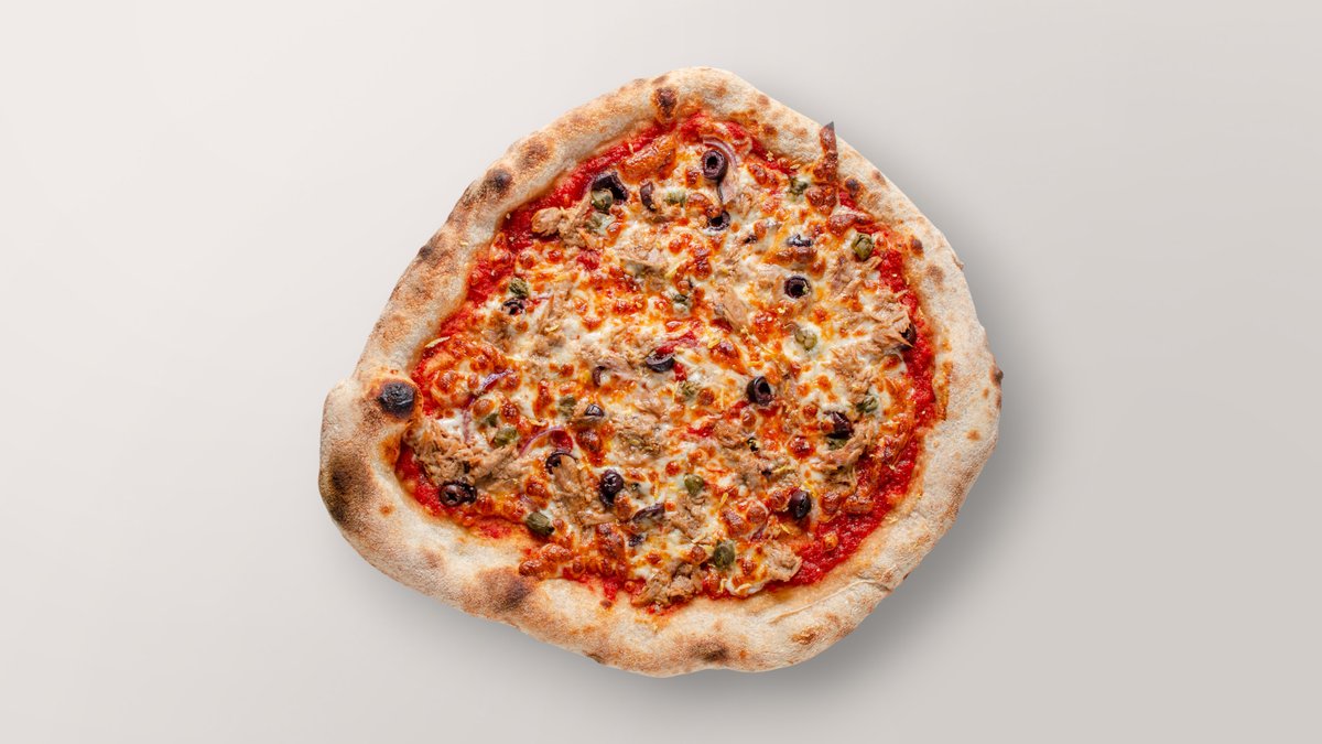(32см) първокласна туна със специален доматен сос, лайт моцарела, каперси, маслини, червен лук. Всички пици са приготвени със високо протеиново пълнозърнесто тесто, с двойна ферментация на над 50 часа