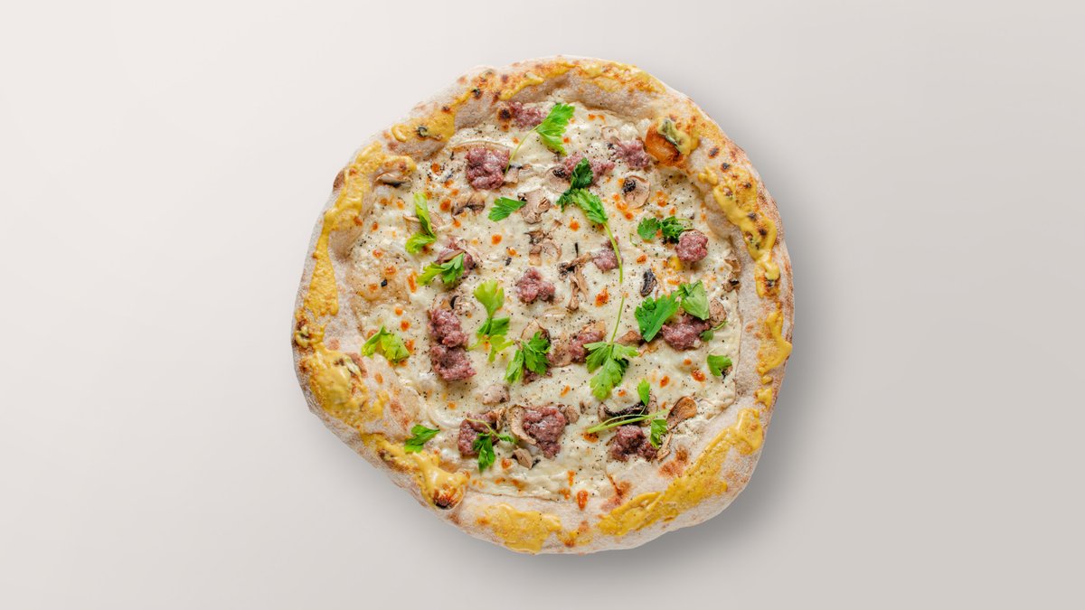 (32см, 743кал, 39г протеин) 21.99 лв пица с оризова сметана, чесън и горчица, комбинирани с ароматни гъби, лук, черен пипер и телешка кайма, покрита с разтопена моцарела и пресен магданоз за освежаваща нотка.