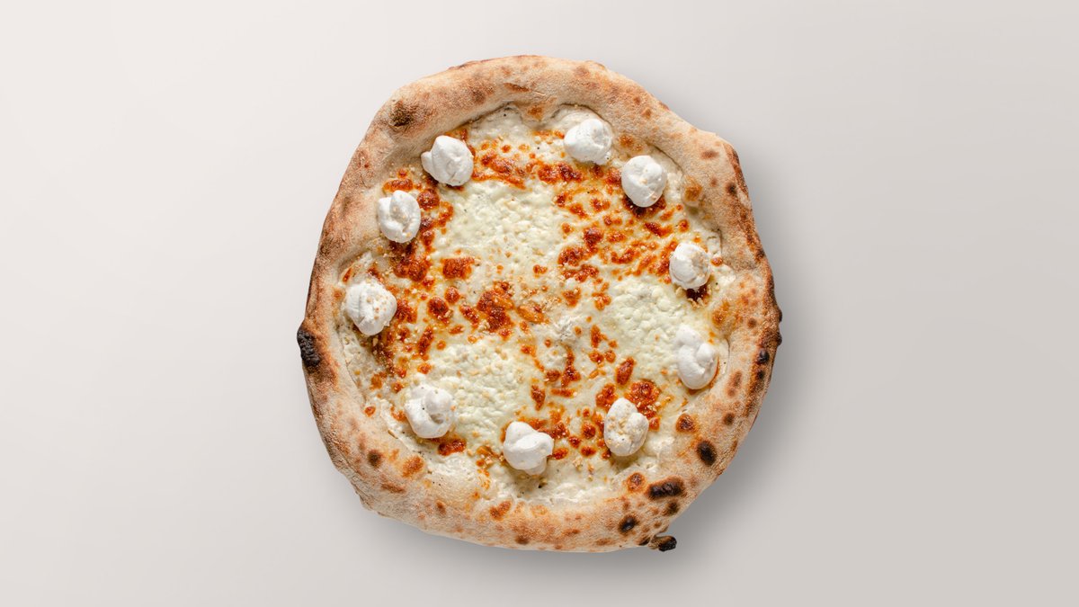 (32см, 685кал, 40г протеин) като четири сирена.. ама ПРО! Крем от оризова сметана, специален домашен веган пармезан, котидж сирене, лайт моцарела, протеинов мус извара! Всички пици са приготвени със високо протеиново пълнозърнесто тесто, с двойна ферментация на над 50 часа