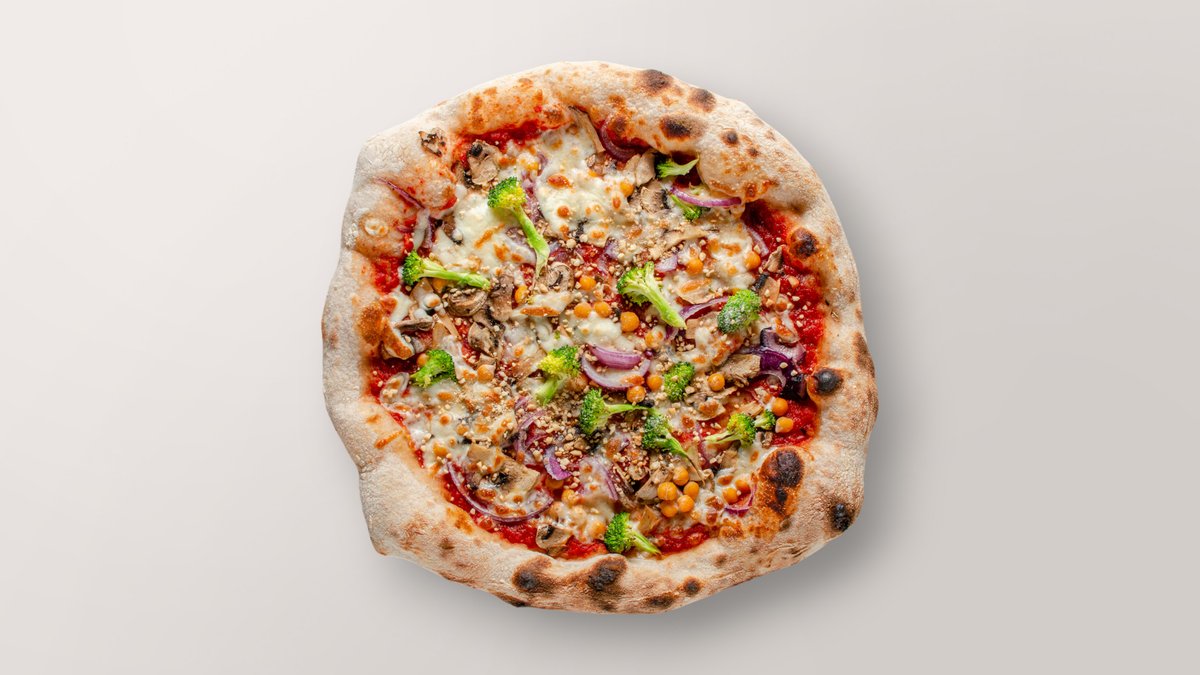 (32см, 659кал, 29г протеин) и за вегетарианците не сме забравили! Специалния доматен сос с лайт моцарела, нахут, гъби, червен лук и свежи броколи! Всички пици са приготвени със високо протеиново пълнозърнесто тесто, с двойна ферментация на над 50 часа