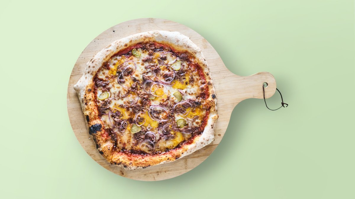 доматен сос, барбекю сос, моцарела, чедър, дърпано телешко, лук, кисели краставички
