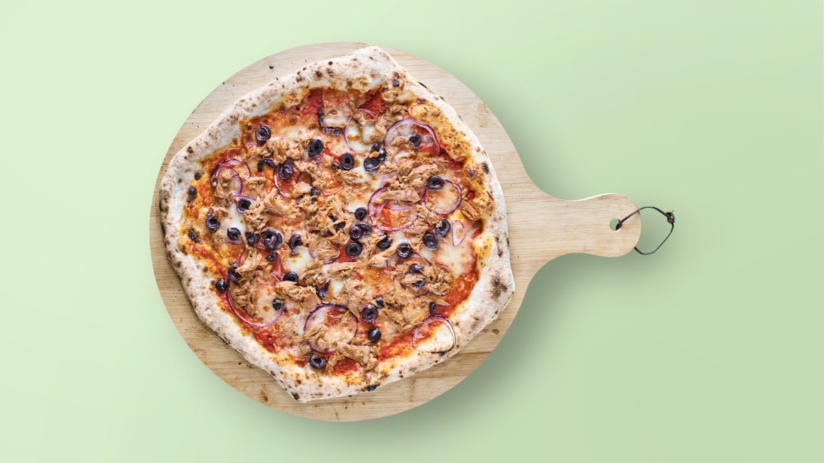 доматен сос, моцарела, риба Тон, червен лук, маслини