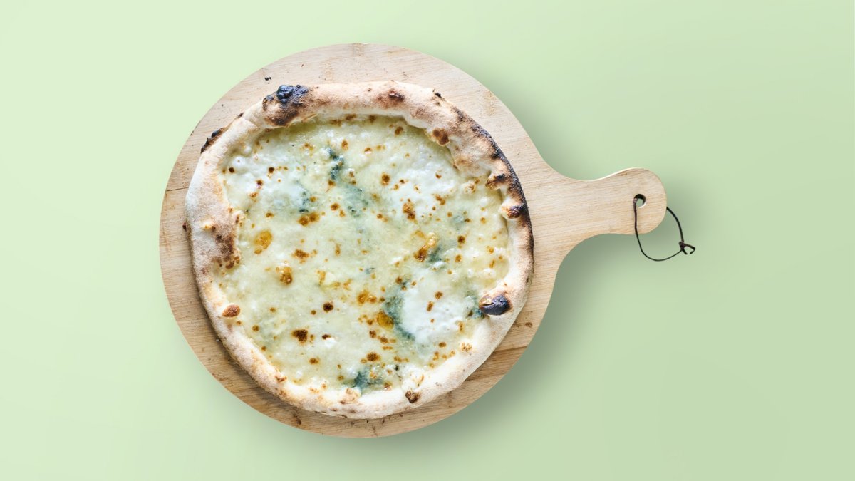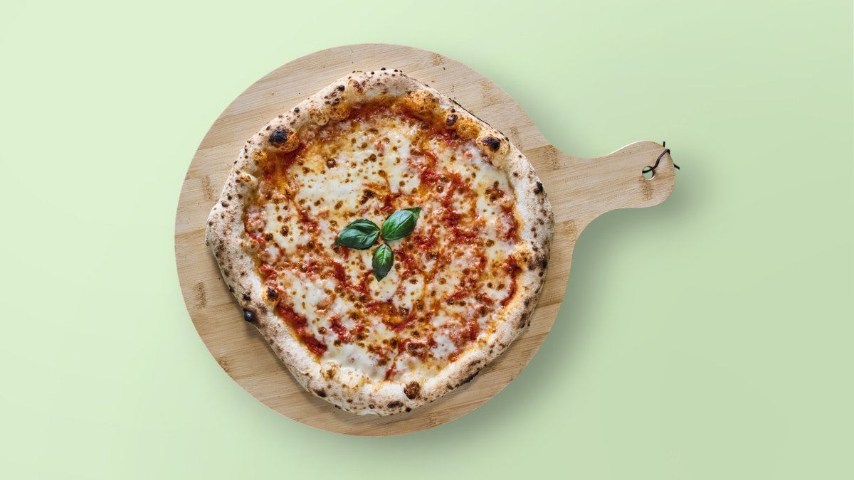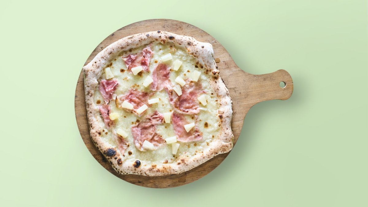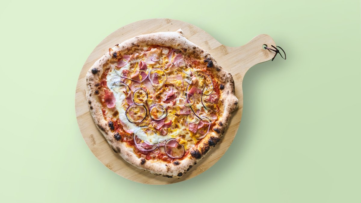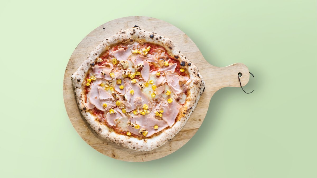 доматен сос, моцарела, пилешка шунка, пушено сирене, царевица