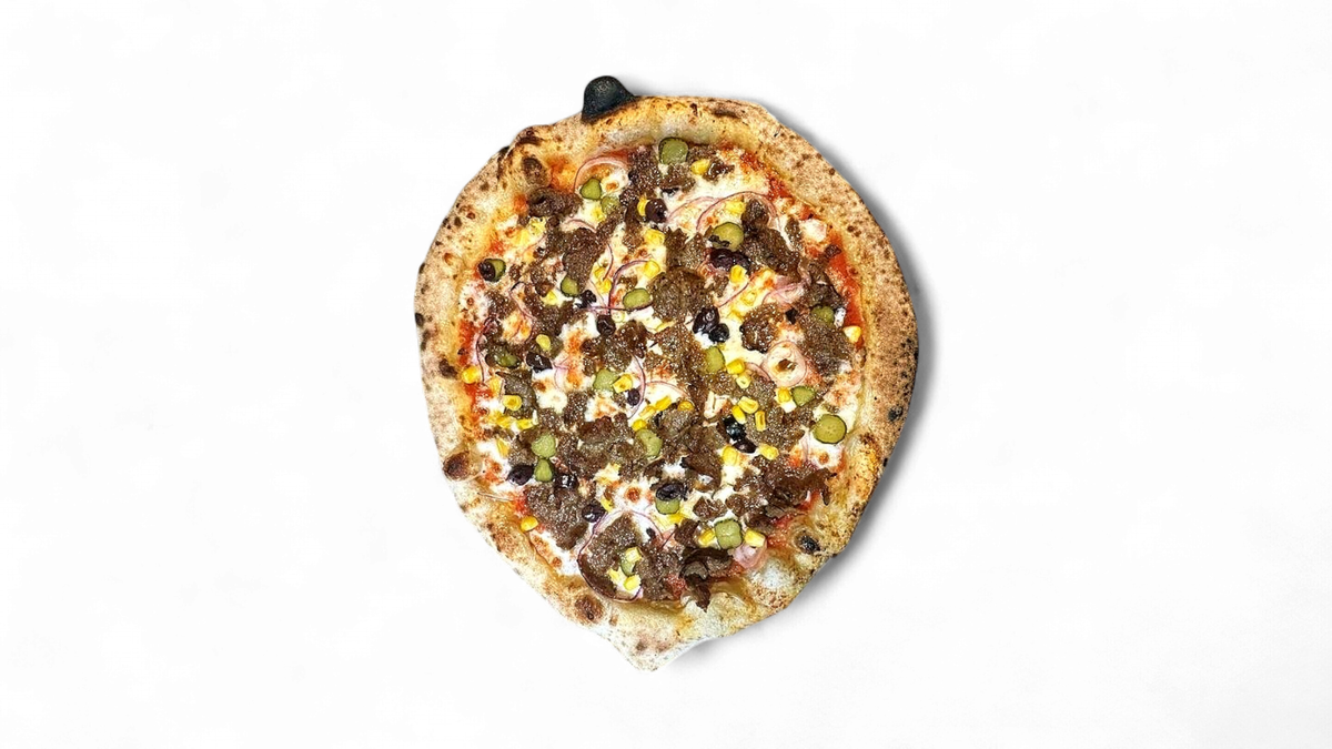 Доматен сос, моцарела, телешко месо от дюнер, лук, царевица, маслини и кисели краставици