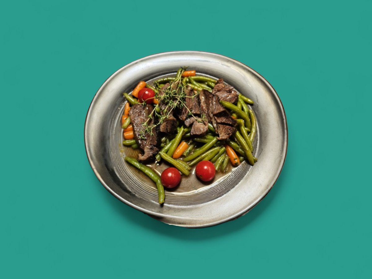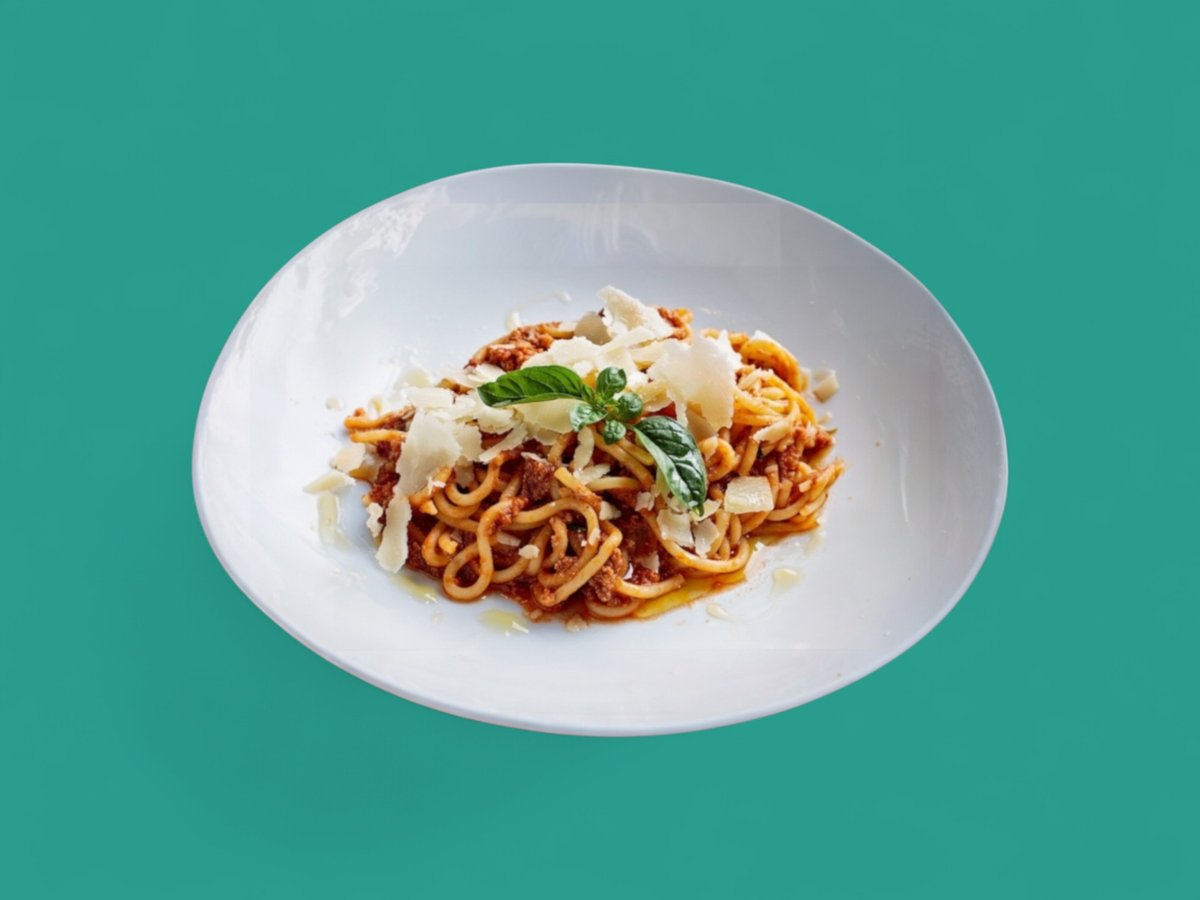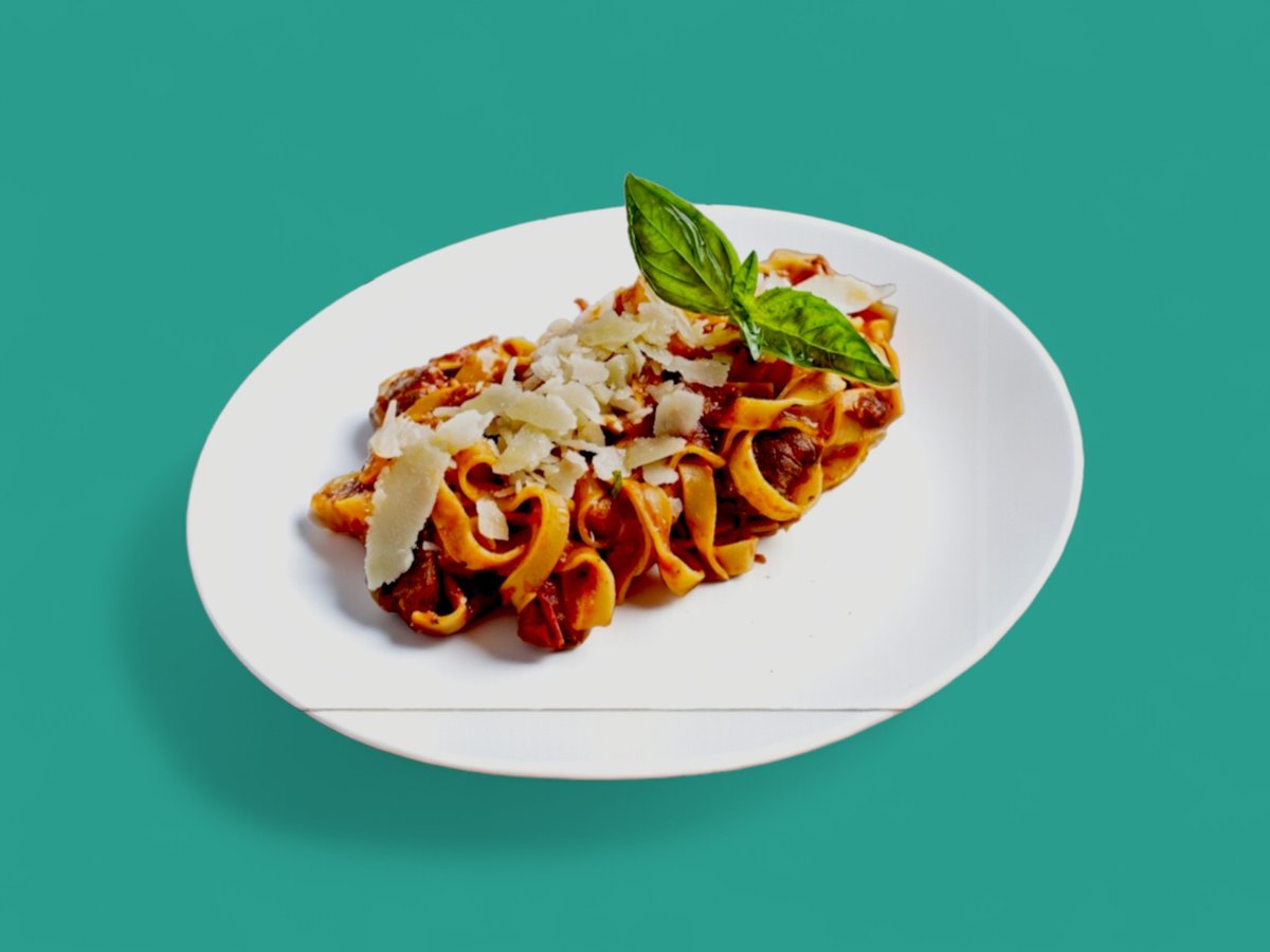 Талиатели с телешко филе, доматен сос, чери домати, чесън и Пармезан