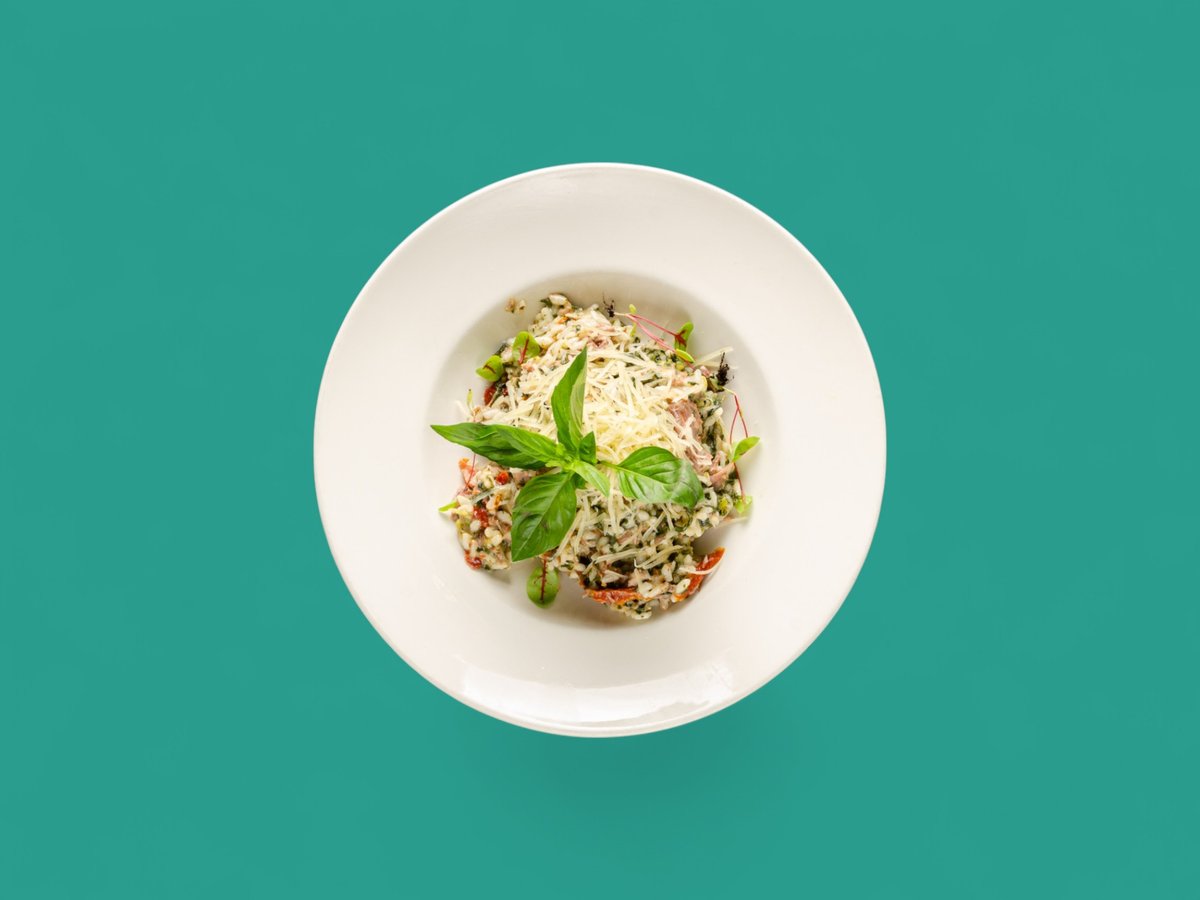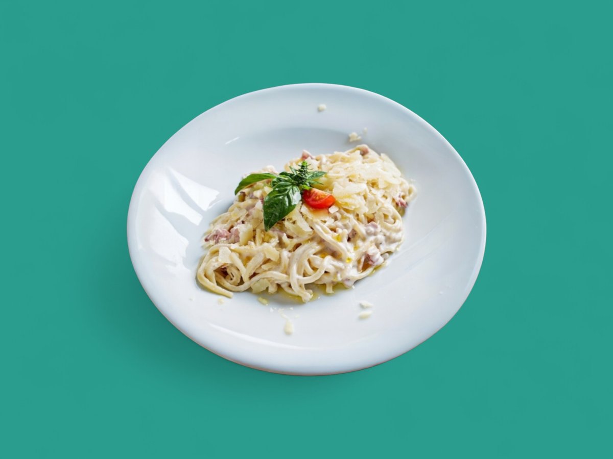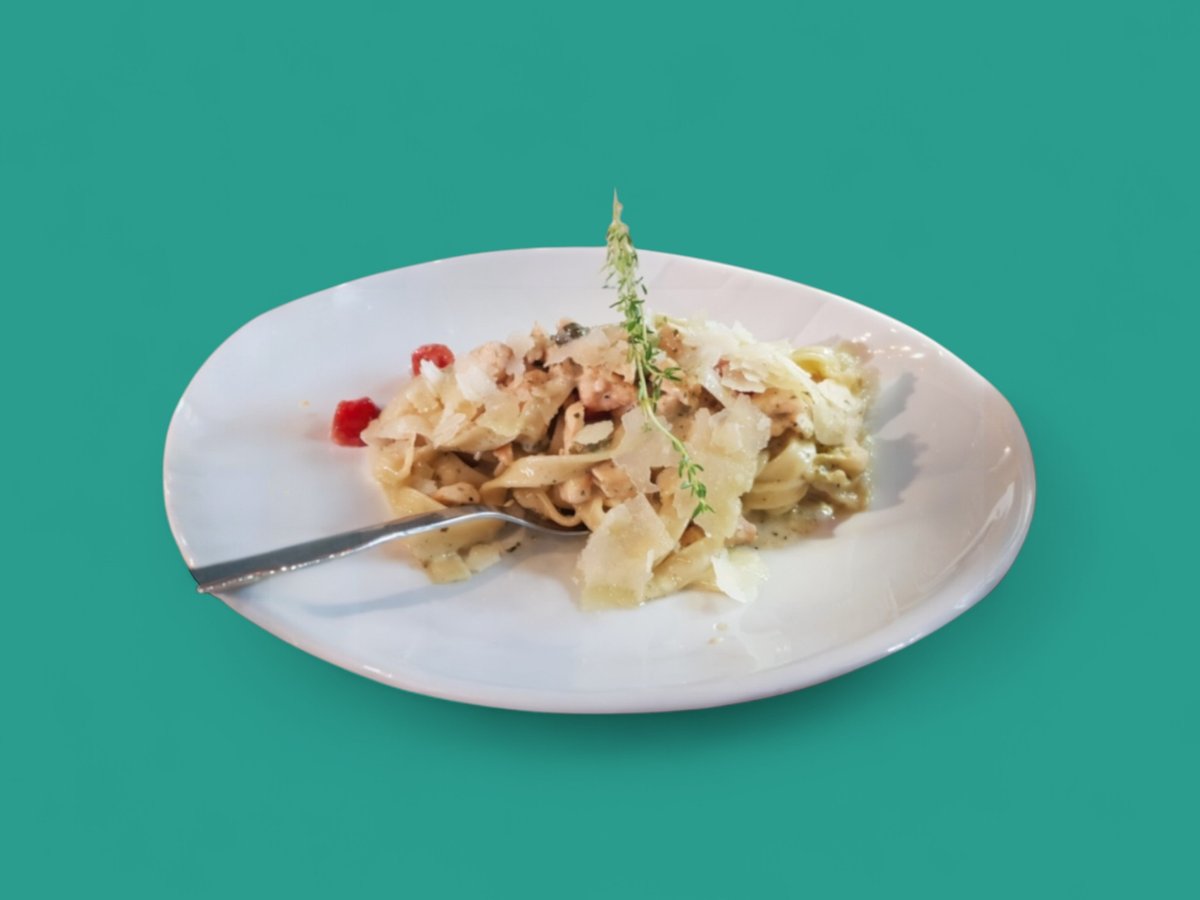 Талиатели със сьомга, сметана, каперси, домати чери и Пармезан