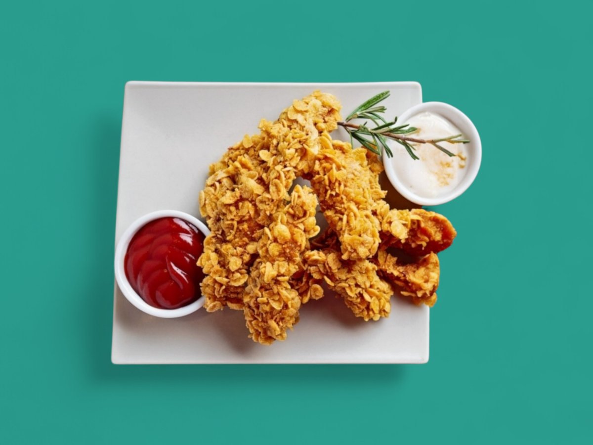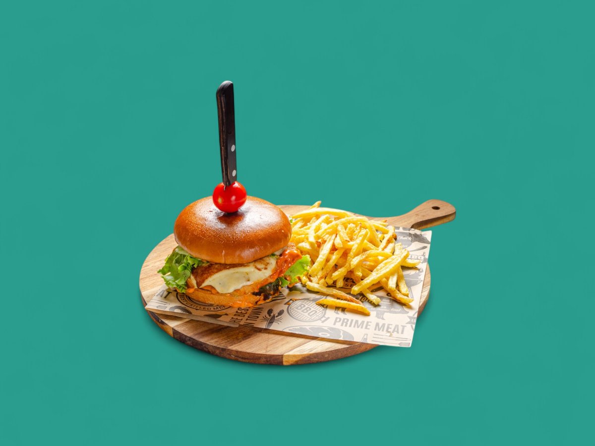 кашкавал, пилешко филе, топено сирене, царевица, кисели краставички, доматен сос 430г