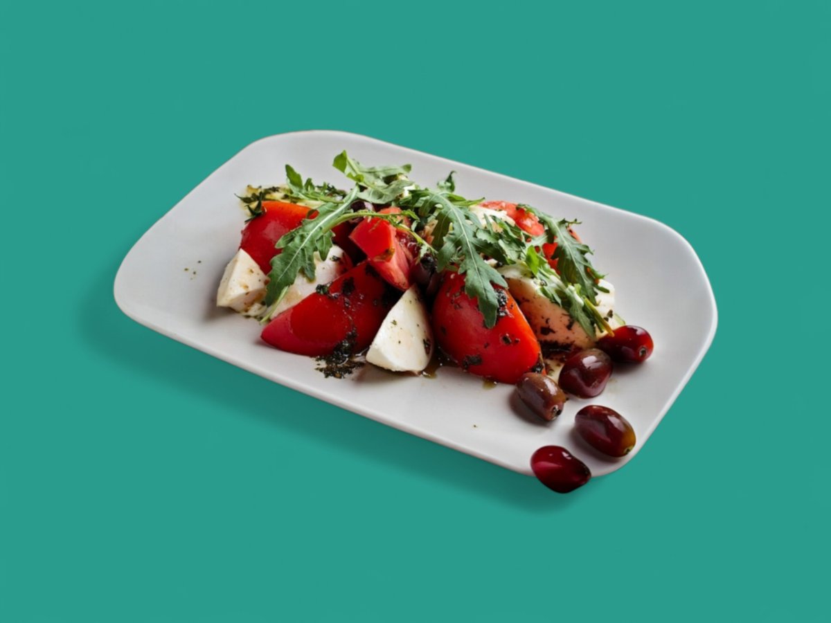 белени домати, моцарела, домашно песто, маслини и рукола 350г