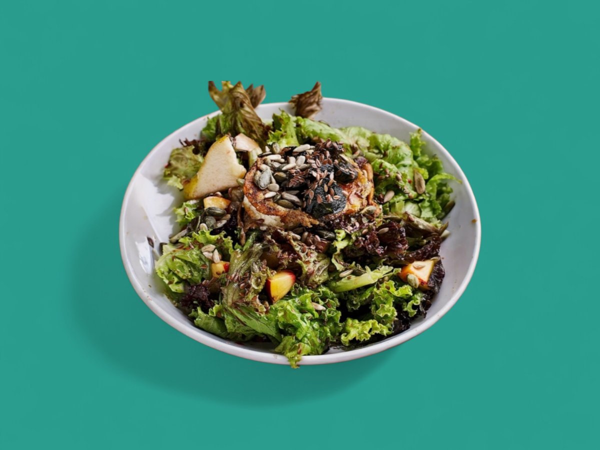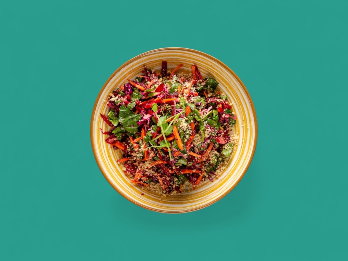 спанак, моркови, червено зеле, цвекло, ябълка, орехи и малинов винегрет 350г