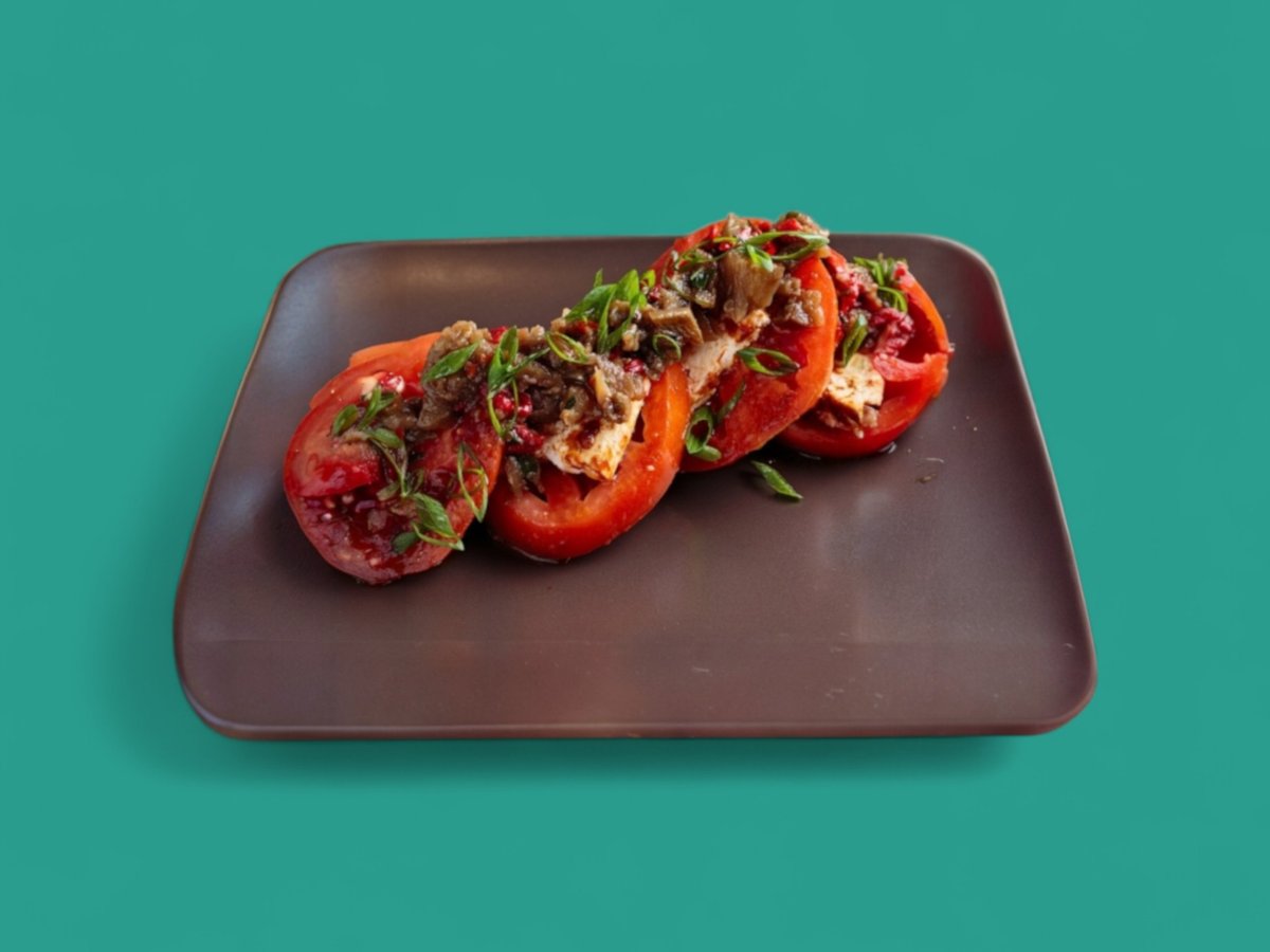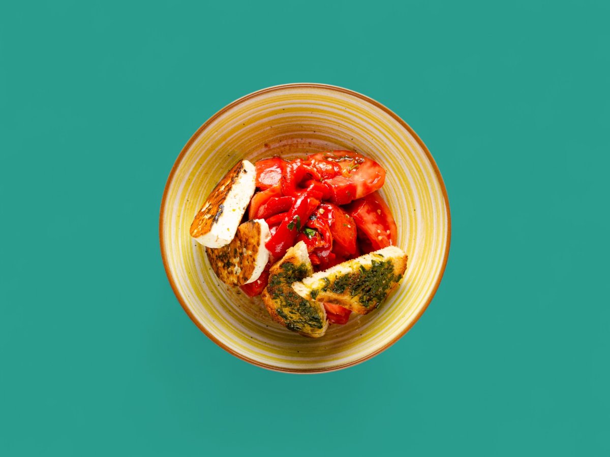 белени домати, мариновани печени червени чушки, брускета и сусам 400г