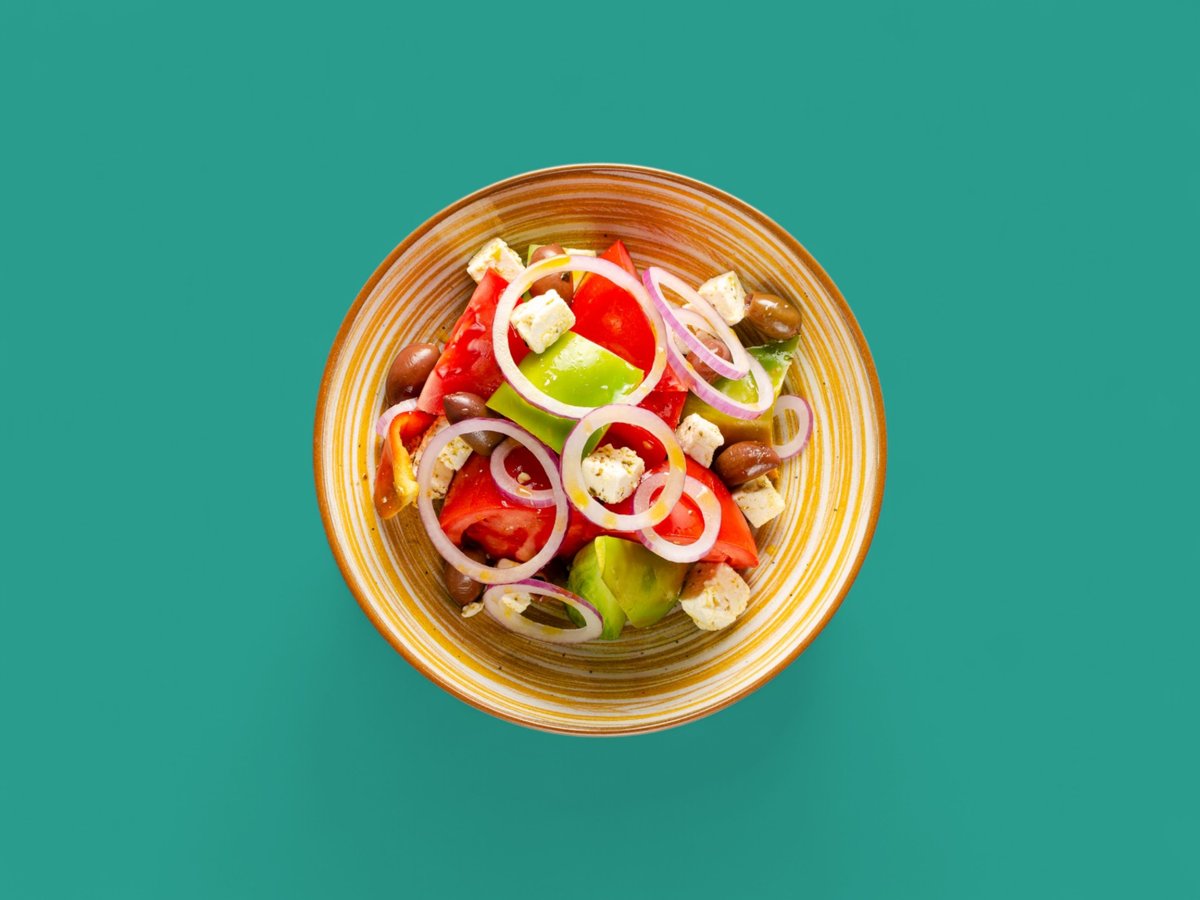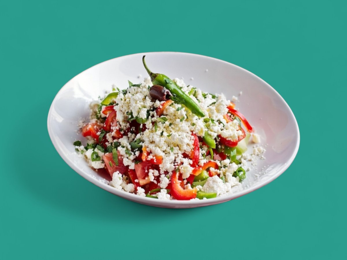 домати, краставици, пресни чушки, сирене фета, маслини, лук, зехтин, риган 430г