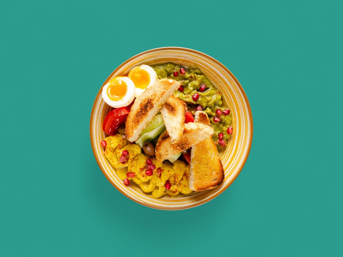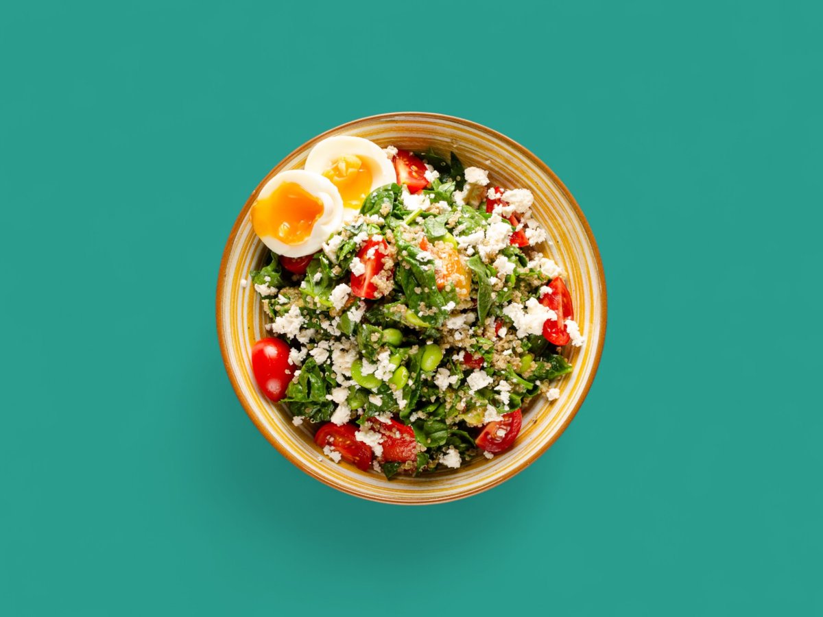 печени чушки, сирене, едамаме, авокадо, рохко яйце, чери и соево-горчичен дресинг 370г