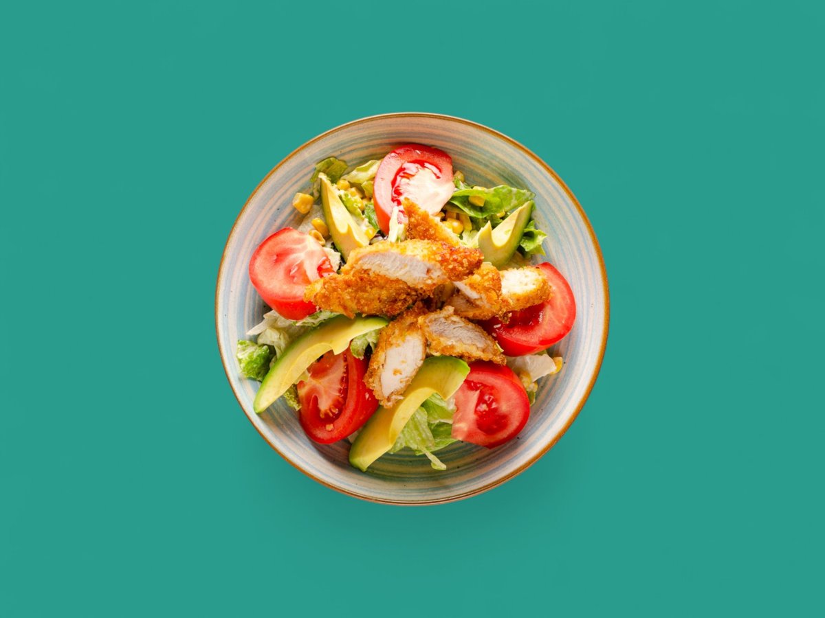 айсберг, червено зеле, авокадо, печени чушки, рохко яйце, тортила чипс и чери домати 370 г