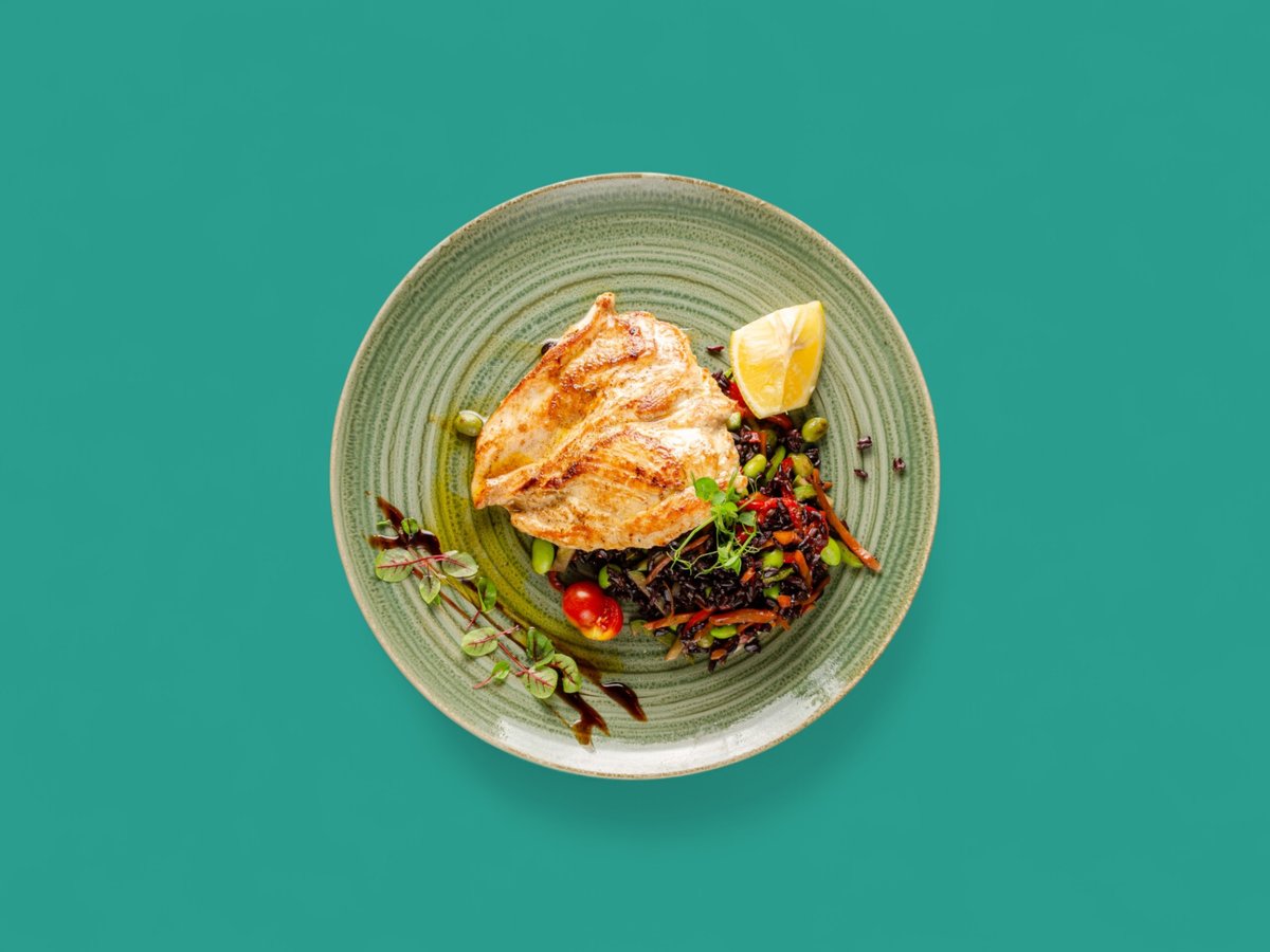 Филе от лаврак с печени тиквички, чери домати и средиземноморски дресинг