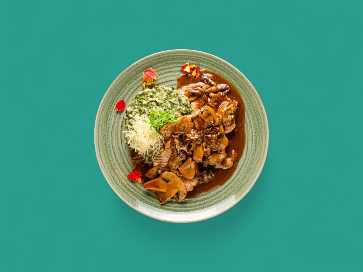 Ризото с млечно телешко, спанак сметана, сушени домати и Пармезан