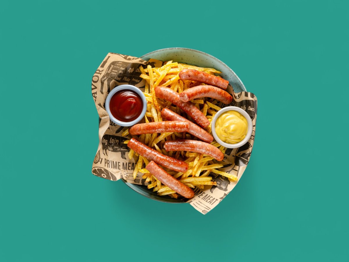 с пресни пържени картофи, сос кетчуп и сос горчица 400г