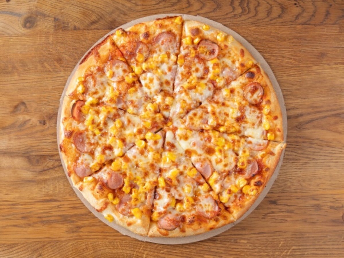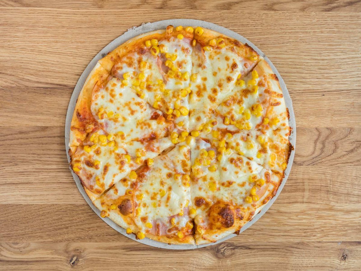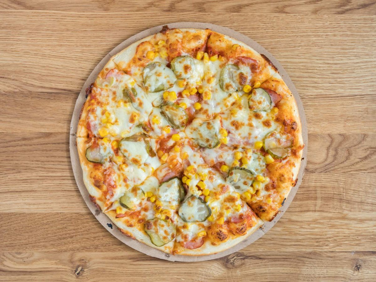 Доматен сос, бекон, царевица, кисели краставици, кашкавал