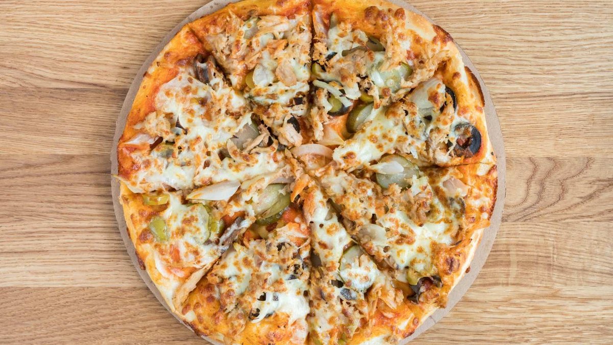 Доматен сос, риба тон, кисели краставици, маслини, лук, кашкавал