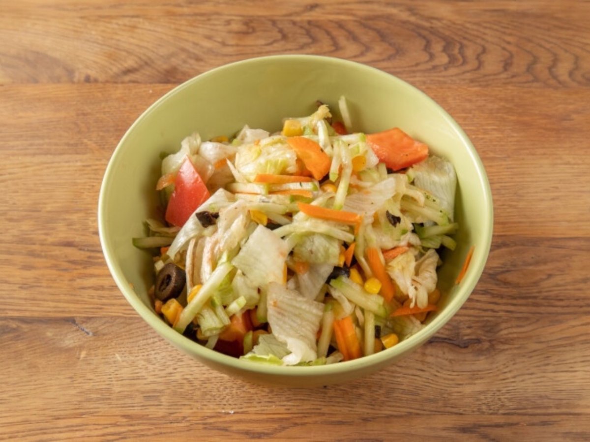 Айсберг, домати, краставици, маслини, царевица, моркови, олио, оцет, сол 350г