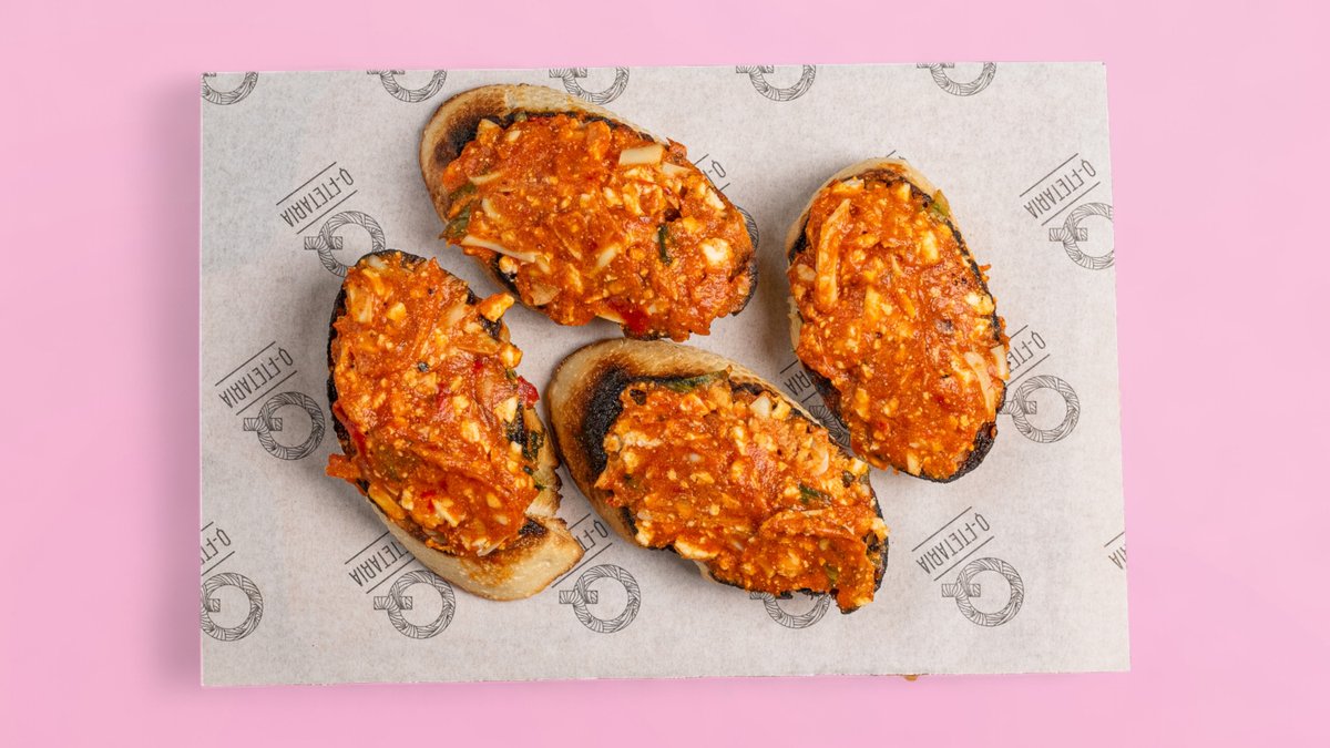с едро смляна лютеница с яйце, пресен лук и сирене върху намазан с песто печен хляб 150г
