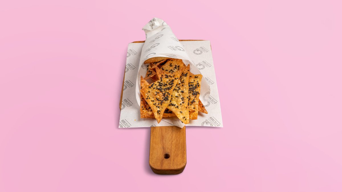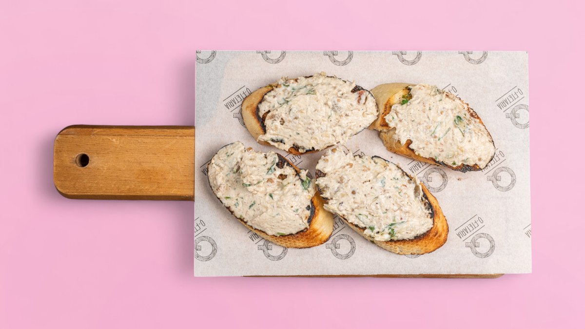 с кисело мляко, патладжан, печен лешник, чесън, магданоз върху намазан с песто печен хляб 150г
