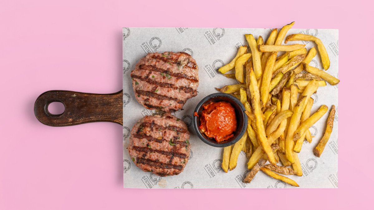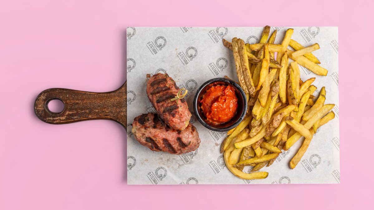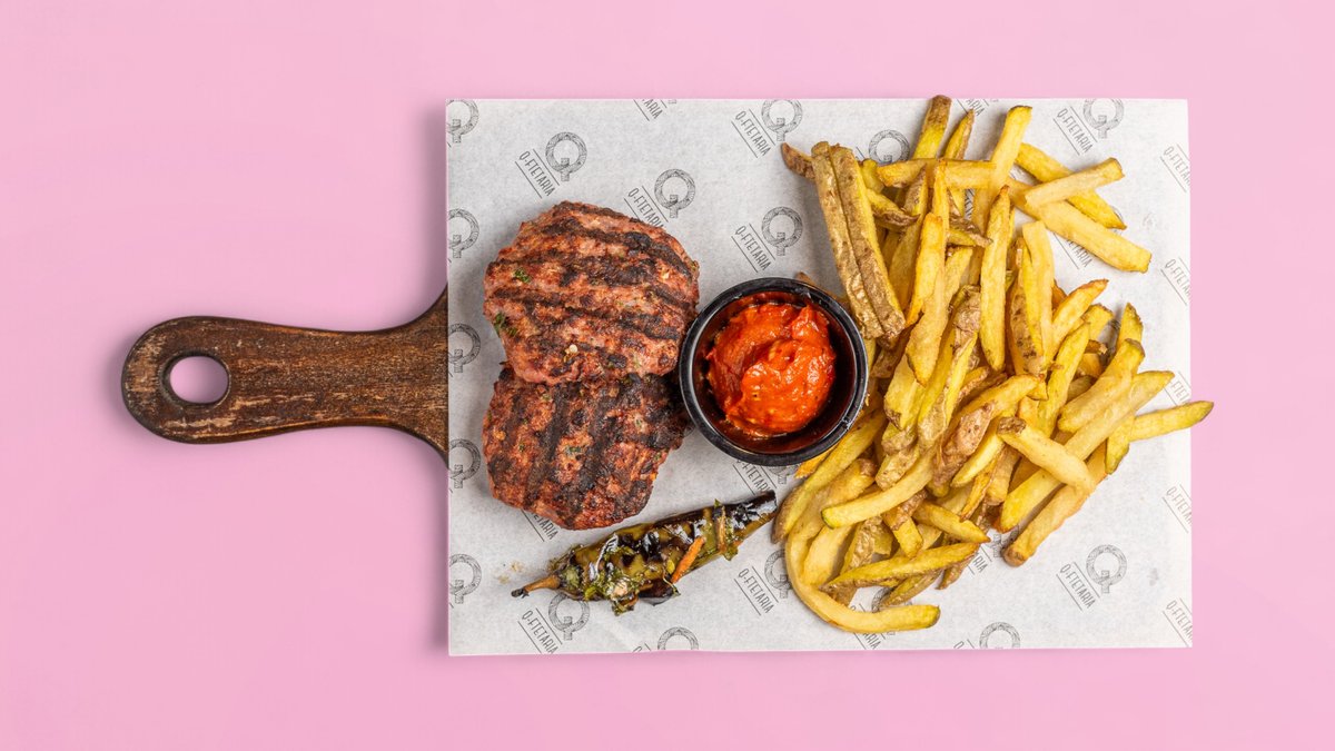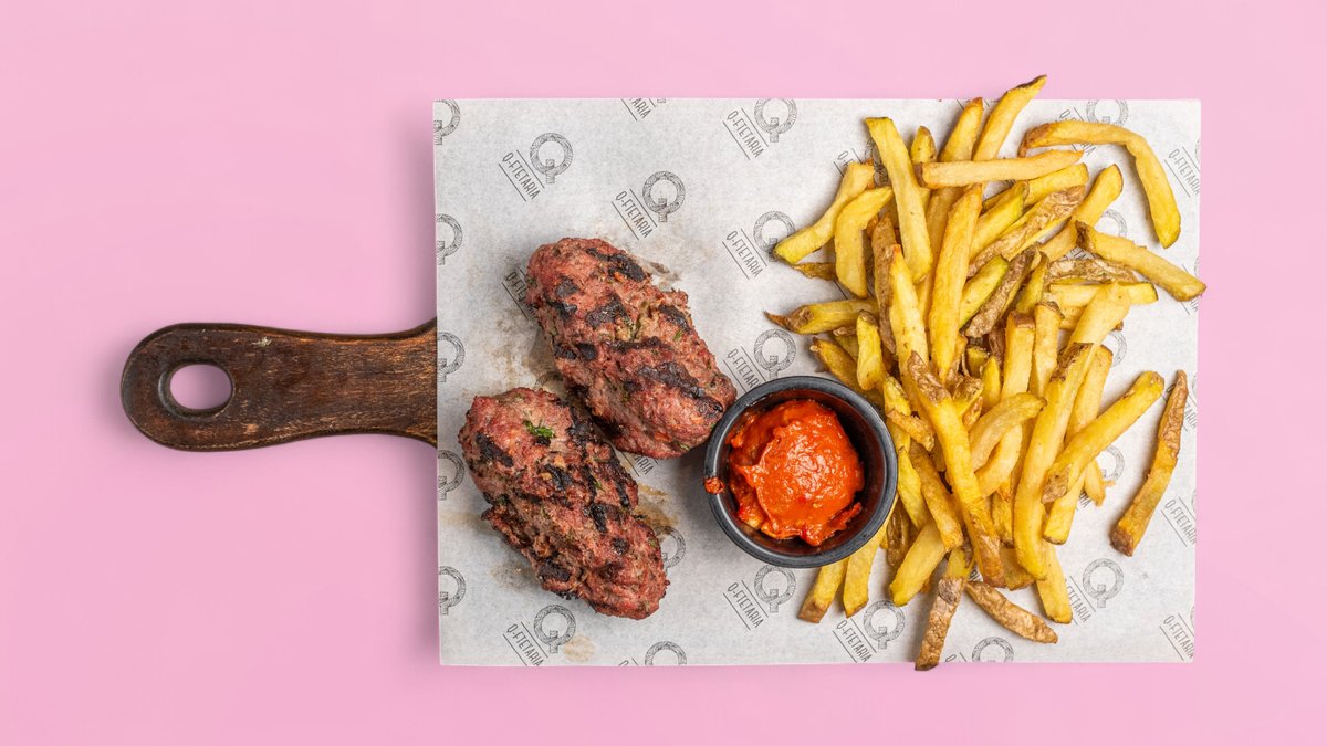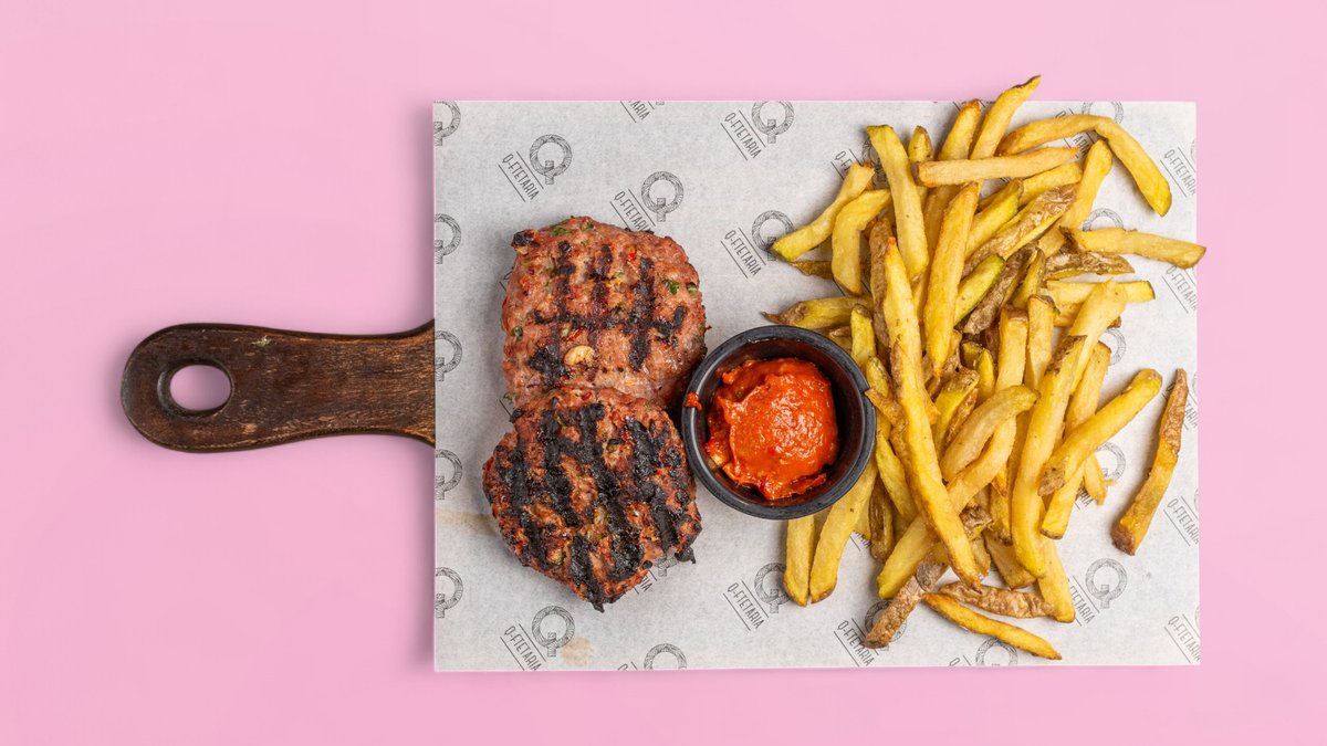 с 2 бр. кюфтета от свинска кайма, сушен домат стафиди, чушка, лук, магданоз, поднесени с пържени картофки, и лютеница 420г