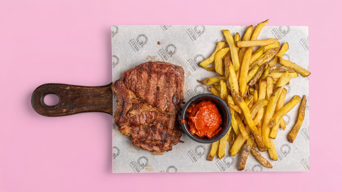 с 2 бр. кюфтета от телешка кайма, лук чушка, поднесени с пържени картофки и лютеница 420г