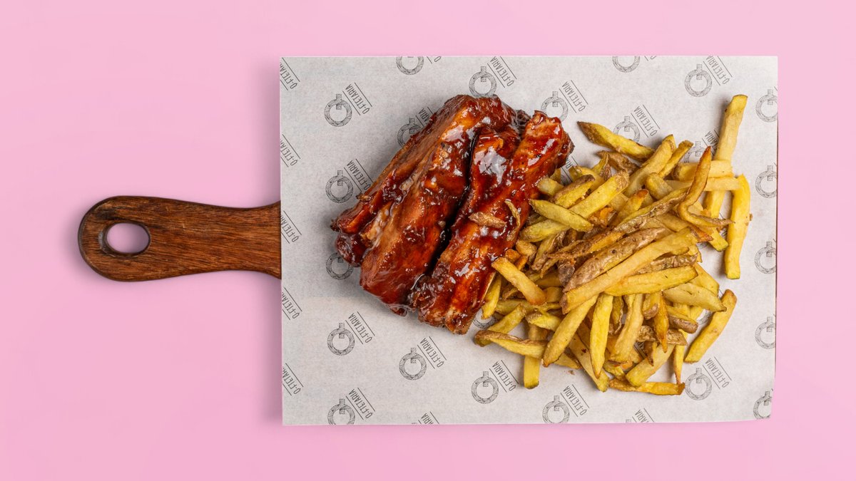 свински ребра, намазани с BBQ сос, поднесени с пържени картофи 450г