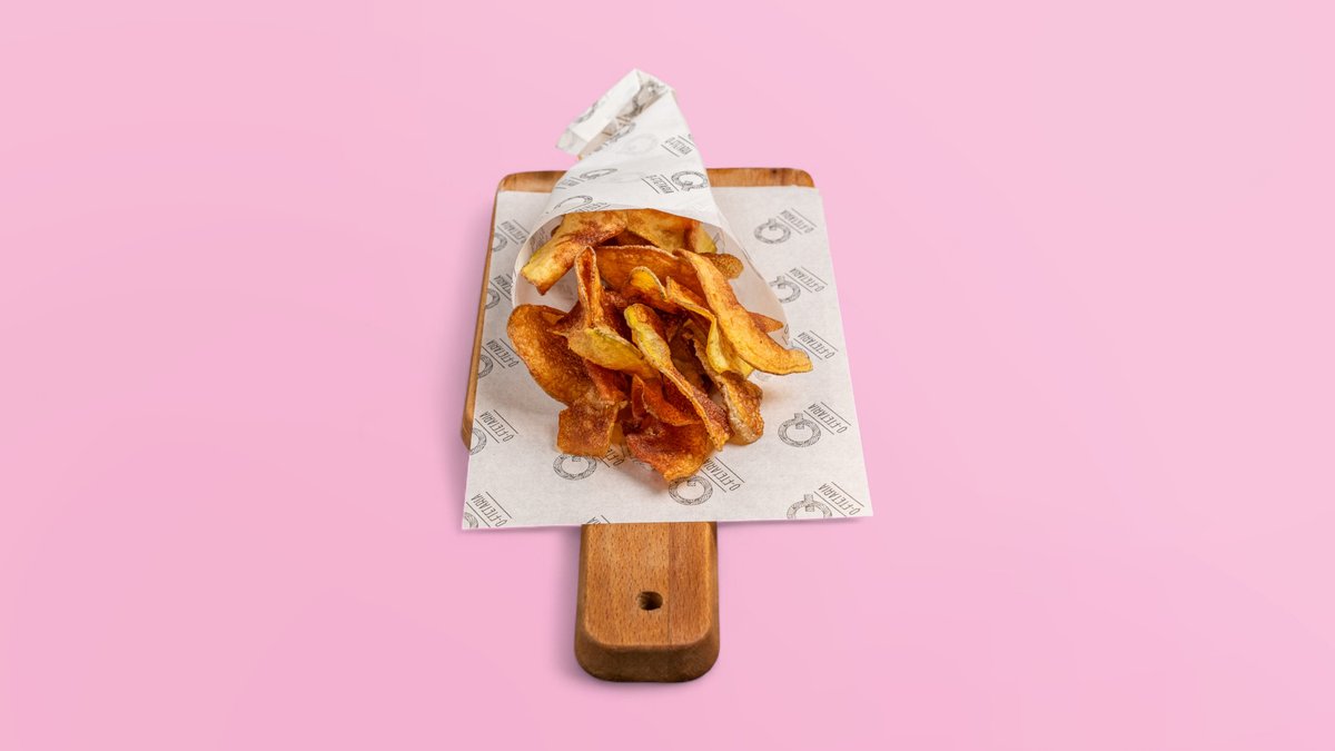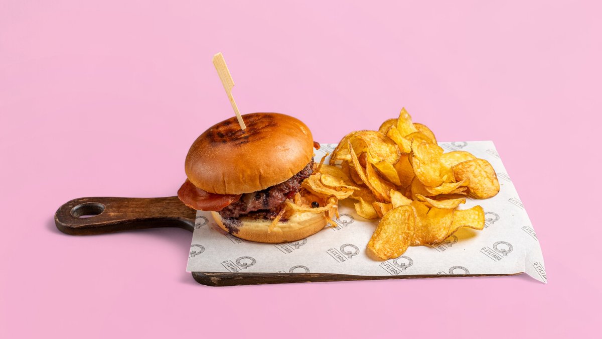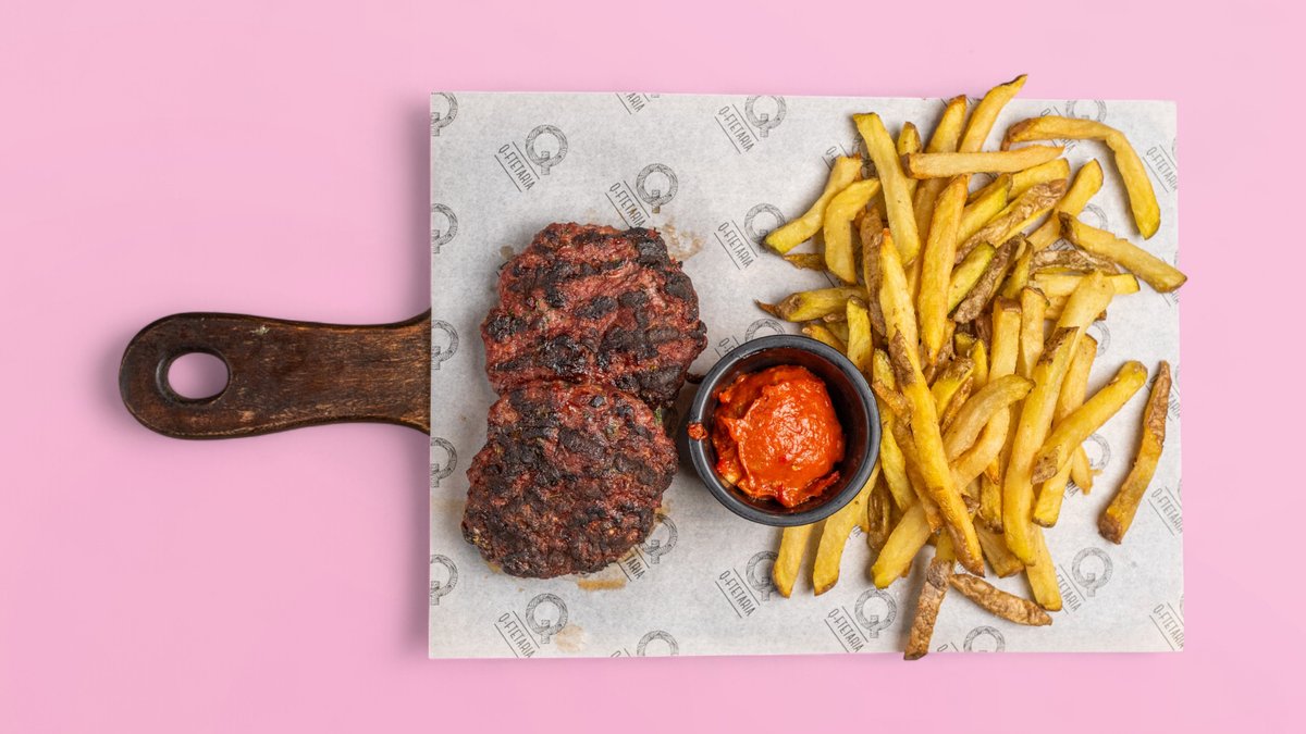 с 2 бр. Q-fteta от свинска кайма, сушено манго, бекон, Чедър поднесени с пържени картофи и лютеница 420г