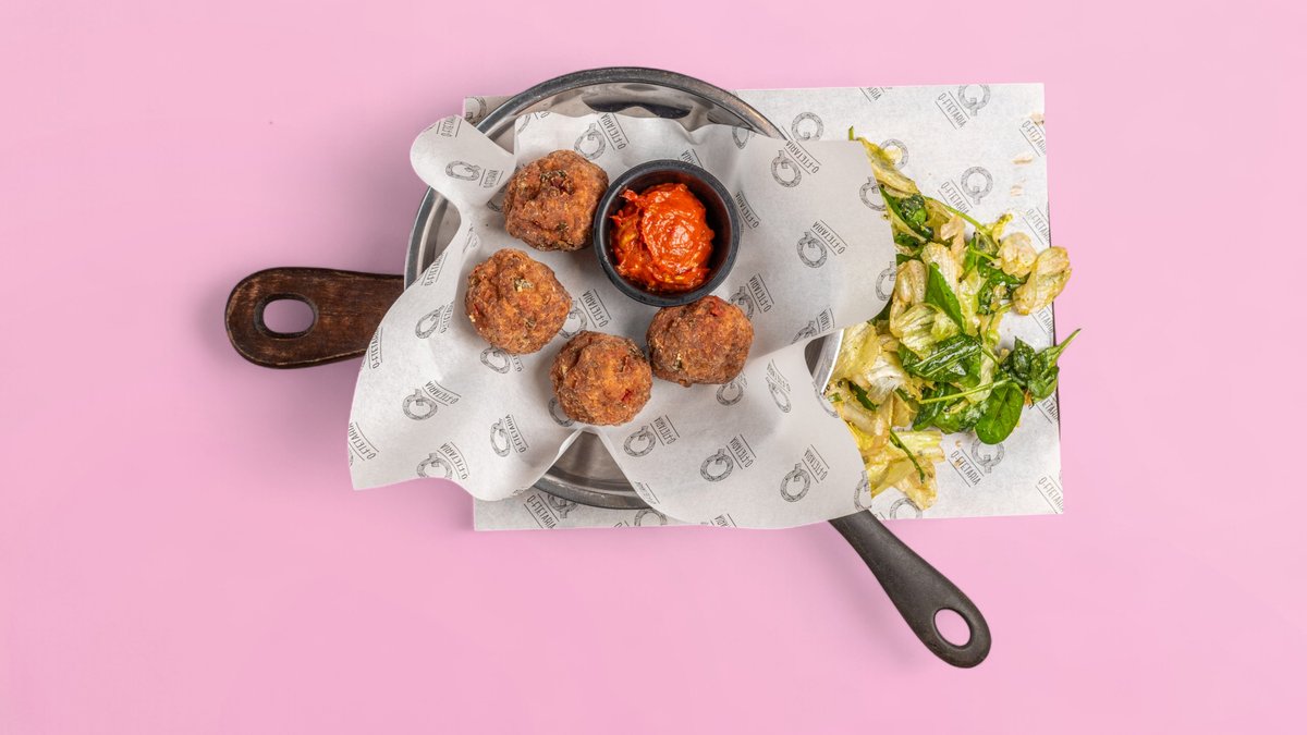 пържени кюфтета от тиквички, яйца, сирене, магданоз, покрити с корнфлейкс, поднесени с микс салати и сос 350г