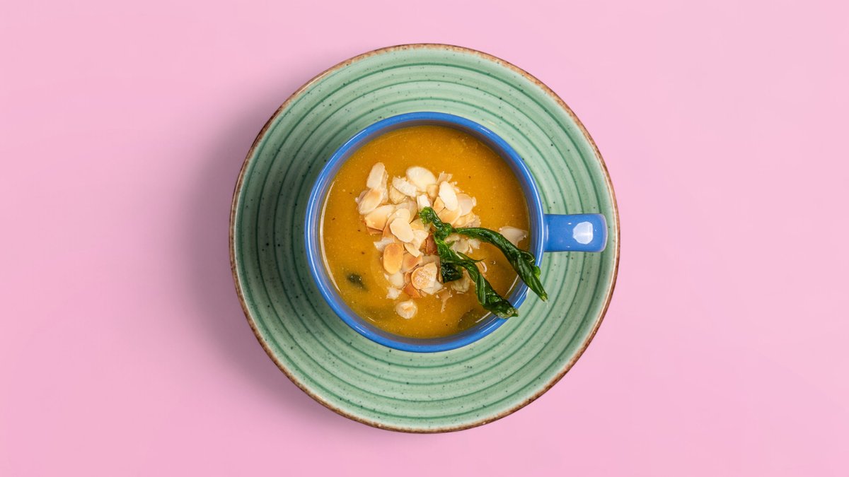 крем супа от тиква, джинджифил, праз лук, кокосово мляко, поръсена с филиран бадем и чипс от босилек 350г