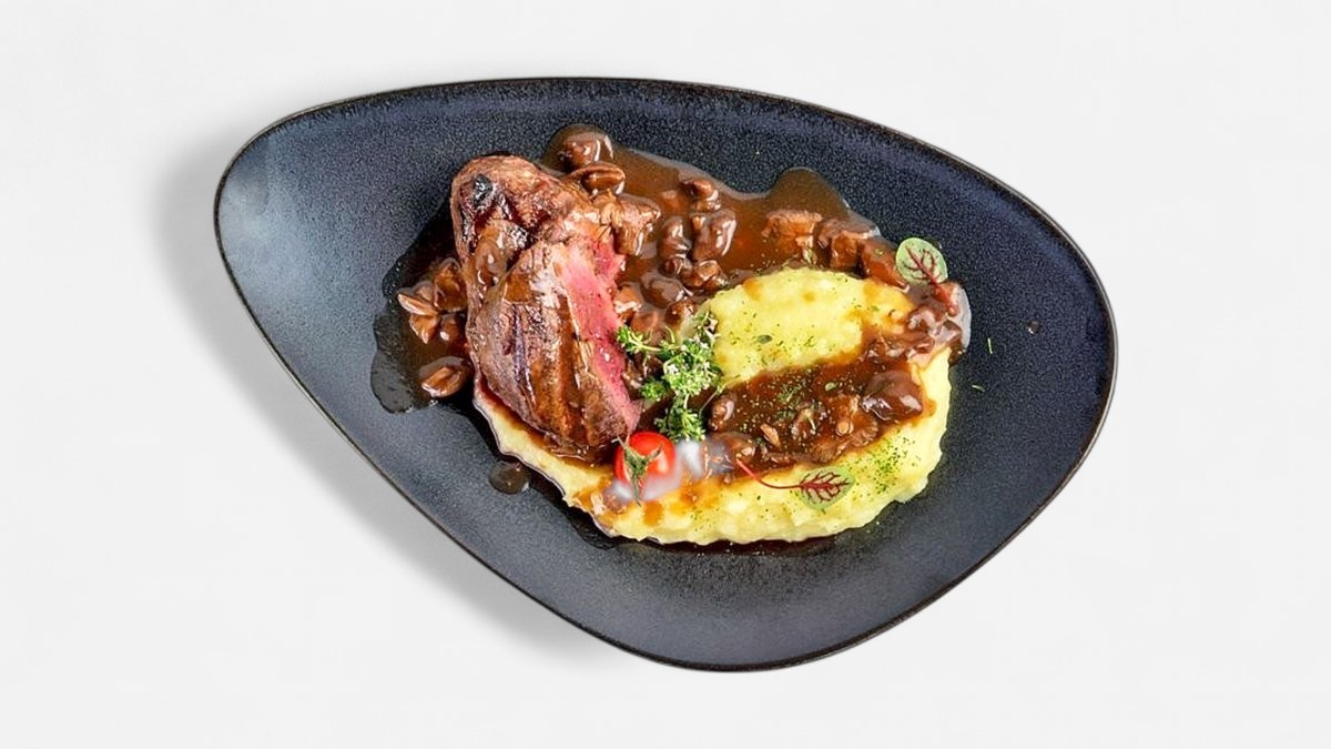 стек Рибай по флорентински, поднесен с билкови картофи и чипс от лук, 400г